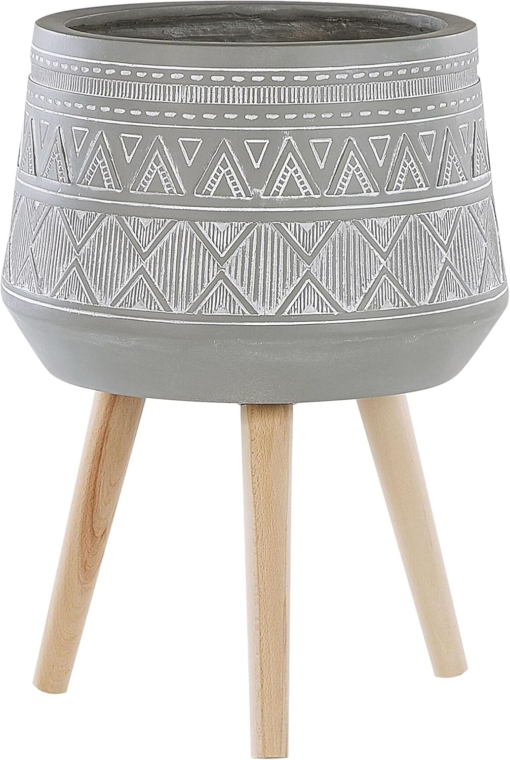 Dekorativer Blumentopf mit Beinen MALAKI aus Keramik in Hellgrau. Dieser stilvolle Pflanzenständer eignet sich sowohl für den Innen- als auch Außenbereich und verleiht jedem Garten, Balkon oder Terrasse eine ansprechende Note. Der robuste, wetterfeste Behälter aus Magnesiumoxid und Buchenholz ist leicht zu bewegen und bietet mit einem Volumen von 30,5 l ausreichend Platz für Ihre Pflanzen. **Highlights** - Handgemaltes Muster für individuelle Gestaltung - Wetterfestes Material für Innen- und Außenbereich - Hohe Beständigkeit gegen UV-Strahlung und Witterungseinflüsse - Pflegeleicht und strapazierfähig - Stabilität durch windbeständige Konstruktion **Produkteigenschaften** - Typ: Outdoor Blumentopf - Stil: Boho - Farbe: Hellgrau - Material: Magnesiumoxid - Zusätzliches Material: Buchenholz - Form: Rund - Abflusslöcher am Boden: Ja - Maße (HxBxT): 61 x 44 x 44 cm - Gewicht: 7 kg - Volumen: 30,5 l **Lieferumfang** - 1 x Blumentopf auf Beinen - Beine / Füße nicht montiert