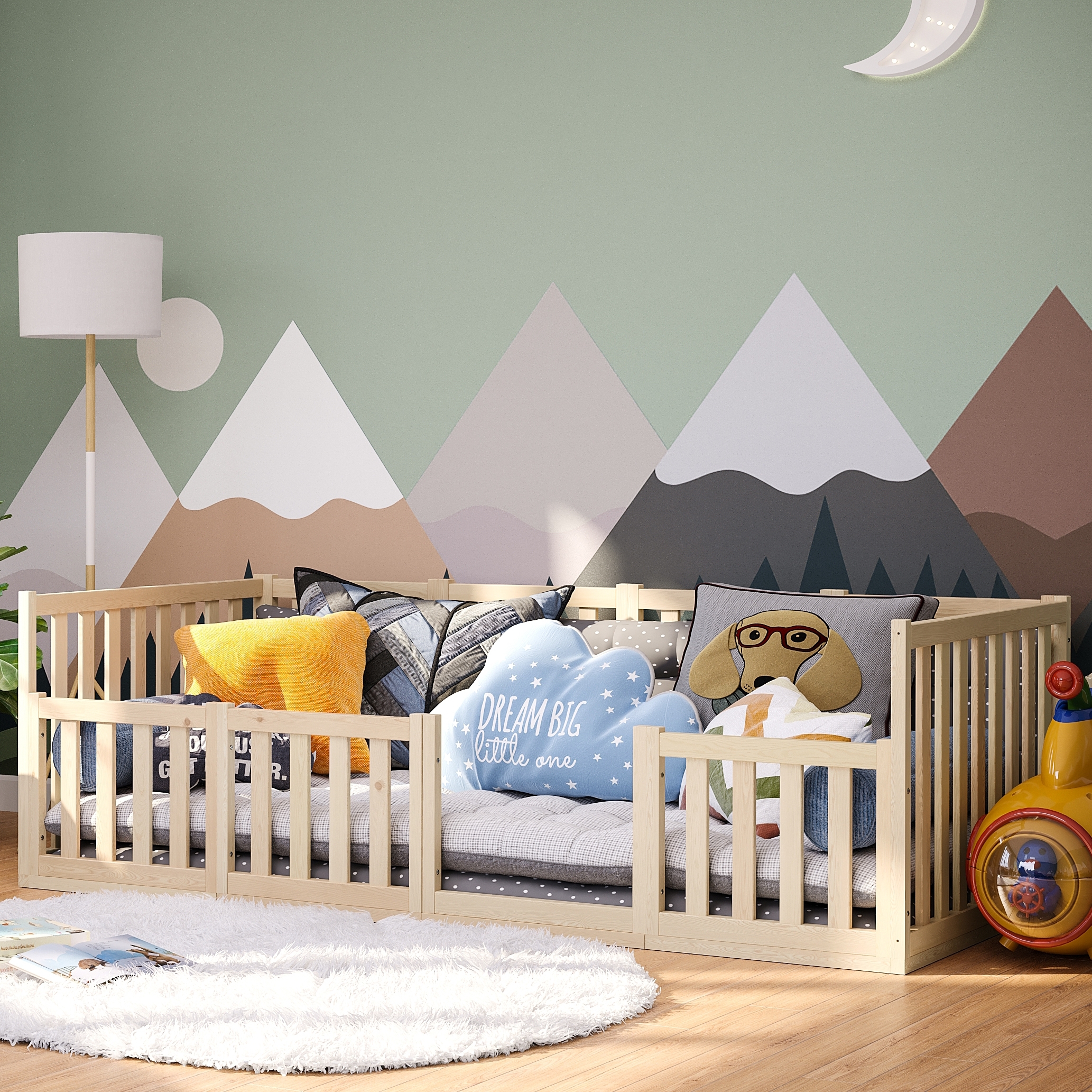Das Bodenbett 'Cuvo' von Bellabino ist die perfekte Schlafgelegenheit für Kinder, die ein behagliches und eigenständiges Schlafumfeld schätzen. Mit einer Liegefläche von 90x200 cm bietet Kinderbett 'Cuvo' eine gemütliche Schlafumgebung, die bereits mit einem passenden Lattenrost ausgestattet ist. Die Öffnung im Rausfallschutz ermöglicht es Ihrem Kind, mühelos in und aus dem Bett zu steigen, ohne auf die Hilfe von Erwachsenen angewiesen zu sein. Dies fördert die Unabhängigkeit und Selbstständigkeit Ihres Kindes. Das minimalistische skandinavische Design von 'Cuvo' fügt sich nahtlos in jedes Kinderzimmer ein. Klare Linien und schlichte Eleganz machen dieses Bett zu einem zeitlosen Schmuckstück. Das Bett ist nicht nur ein Ort zum Schlafen, sondern auch zum Träumen, Spielen und Entspannen. Die robusten Streben des Bettes von Bellabino sind so konzipiert, dass sie maximale Sicherheit gewährleisten, und der Rausfallschutz entlang des Bettes bietet eine sorglose Nachtruhe. Das Bett ist bis zu 100 kg belastbar. Das bedeutet, dass Eltern sich problemlos zu ihren Kindern legen können, um gemeinsam eine Gute-Nacht-Geschichte zu lesen oder kostbare Momente zu teilen. Mit dem Bodenbett 'Cuvo' von Bellabino holen Sie sich nicht nur ein stilvolles Möbelstück ins Kinderzimmer, sondern auch ein praktisches und sicheres Schlafumfeld für Ihr Kind. **Produktdetails:** - Maße: H 68,0 cm / 42,8 cm, T 205,5 cm, B 95,5 cm - Liegefläche: 90x200 cm - Material: Massivholz, MDF - Max. Belastbarkeit: 100 kg - Lieferumfang: Bodenbett inkl. Rausfallschutz und Lattenrost