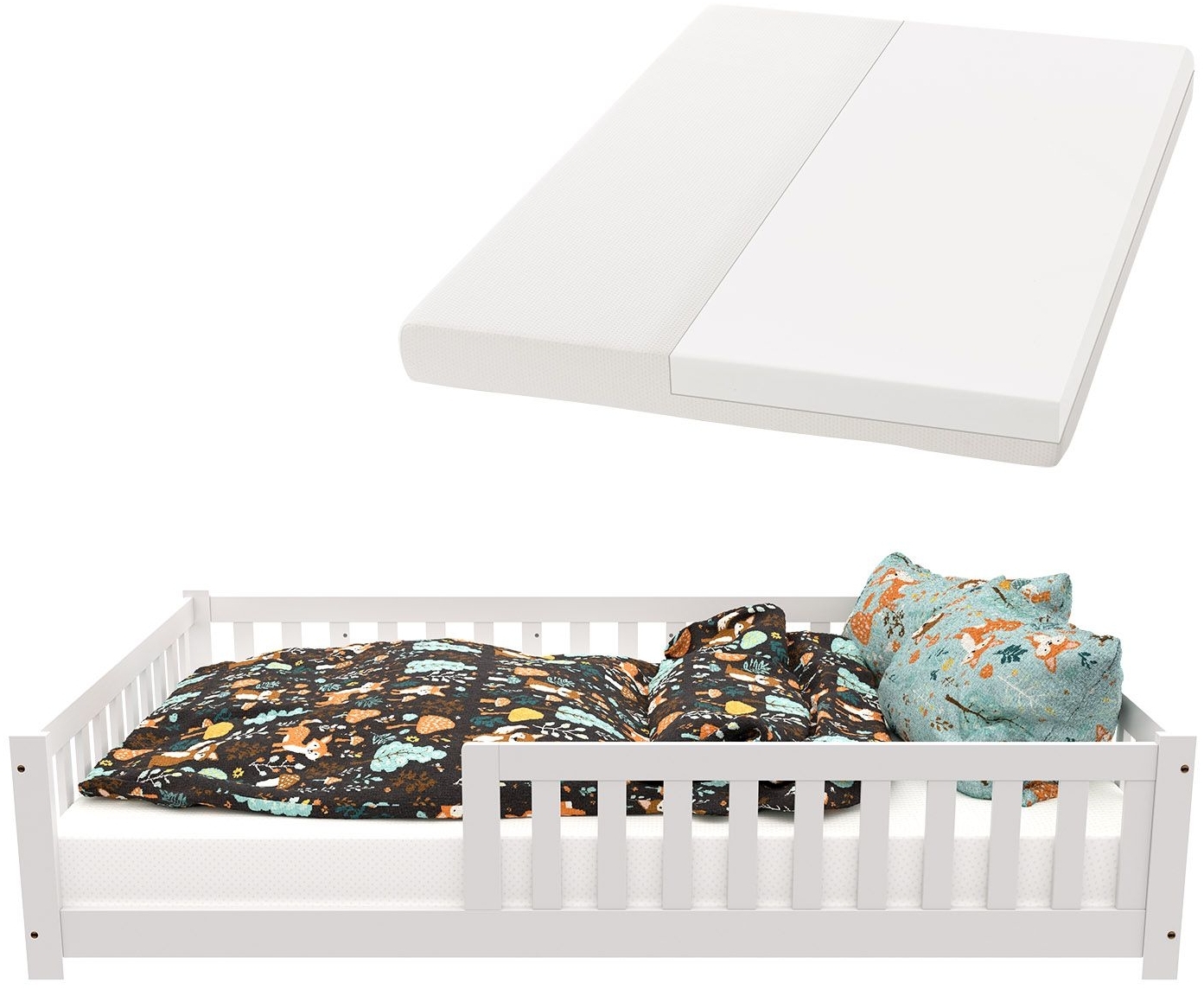 | Name | Juskys 'Naya' Kinderbett - mit Matratze, Rausfallschutz & Lattenrost - Bodenbett für Kinder 3 -10 Jahre - Holz Weiß, 140x200 cm |