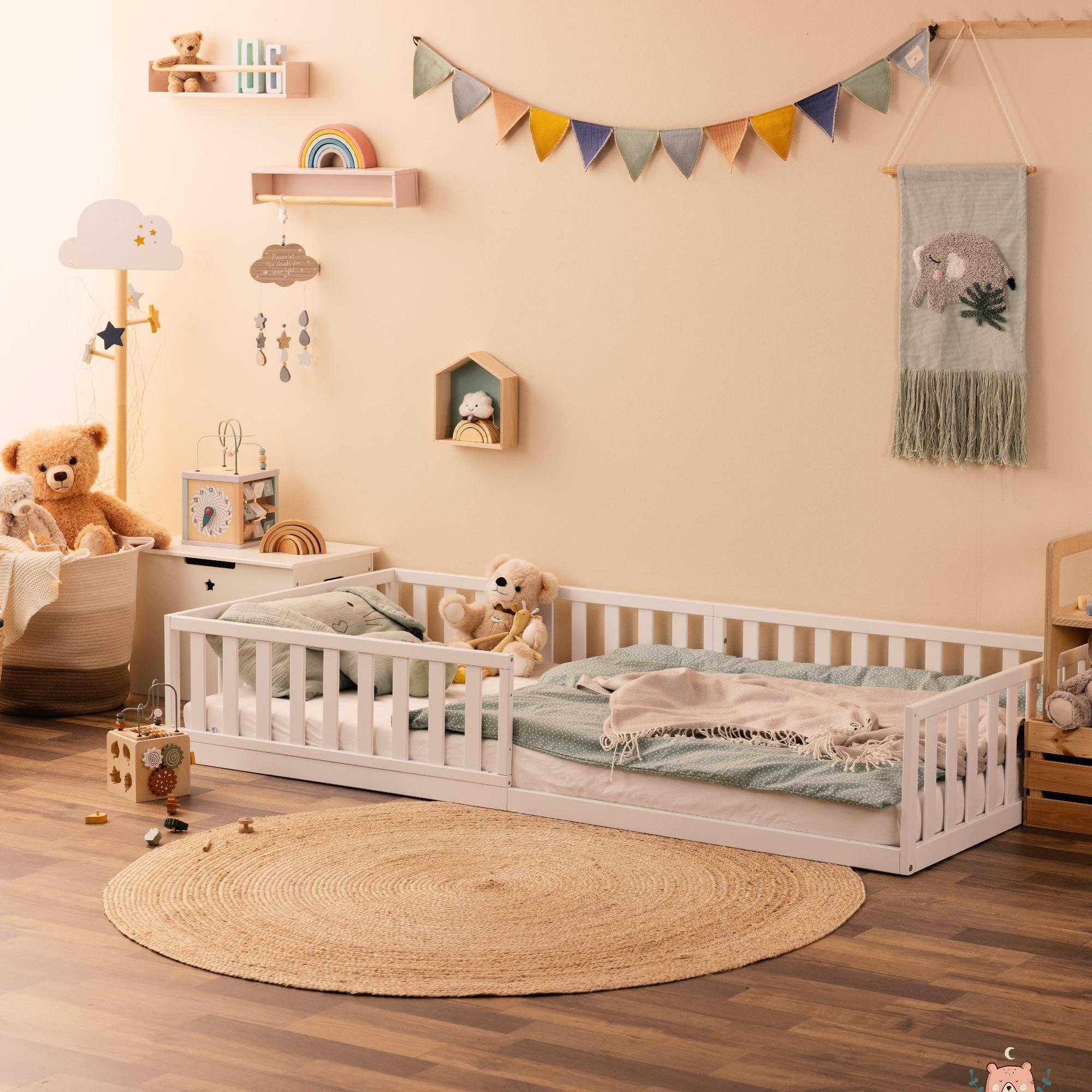 Das Bodenbett 90 x 200 cm in Weiß bietet eine sichere Schlafumgebung für Ihr Kind. Mit einem flexiblen Rausfallschutz, der links oder rechts montiert oder komplett entfernt werden kann, fördert es eigenständiges Ein- und Aussteigen. Hergestellt aus nachhaltigem Kiefernholz, unterstützt es die Montessori-Pädagogik. Das zeitlose Design und die niedrige Liegehöhe schaffen ein ansprechendes und sicheres Schlafumfeld. **Highlights** - Flexibler Rausfallschutz: Montierbar links oder rechts, kann auch entfernt werden. - Europäische Herstellung: Materialien aus der Region und Produktion in der EU. - Stabiler Rolllattenrost: Optimale Luftzirkulation und schöne Einschlafrituale. - Zeitloses Design: Abgerundete Kanten für Sicherheit und Langlebigkeit. - Nachhaltig & fair produziert: Aus nachhaltigem Kiefernholz unter fairen Bedingungen. **Produkteigenschaften** - Abmessungen: 90 x 200 cm - Material: Hochwertiges Massivholz (Kiefer) - Liegehöhe: Niedrig für einfaches Ein- und Aussteigen - Inklusive: Schaumstoffmatratze 90 x 200 cm - Rollrost für optimale Belüftung der Matratze **Lieferumfang** - Bettgestell mit Rollrost - Kindermatratze (kann bis zu 3 Werktage später geliefert werden)