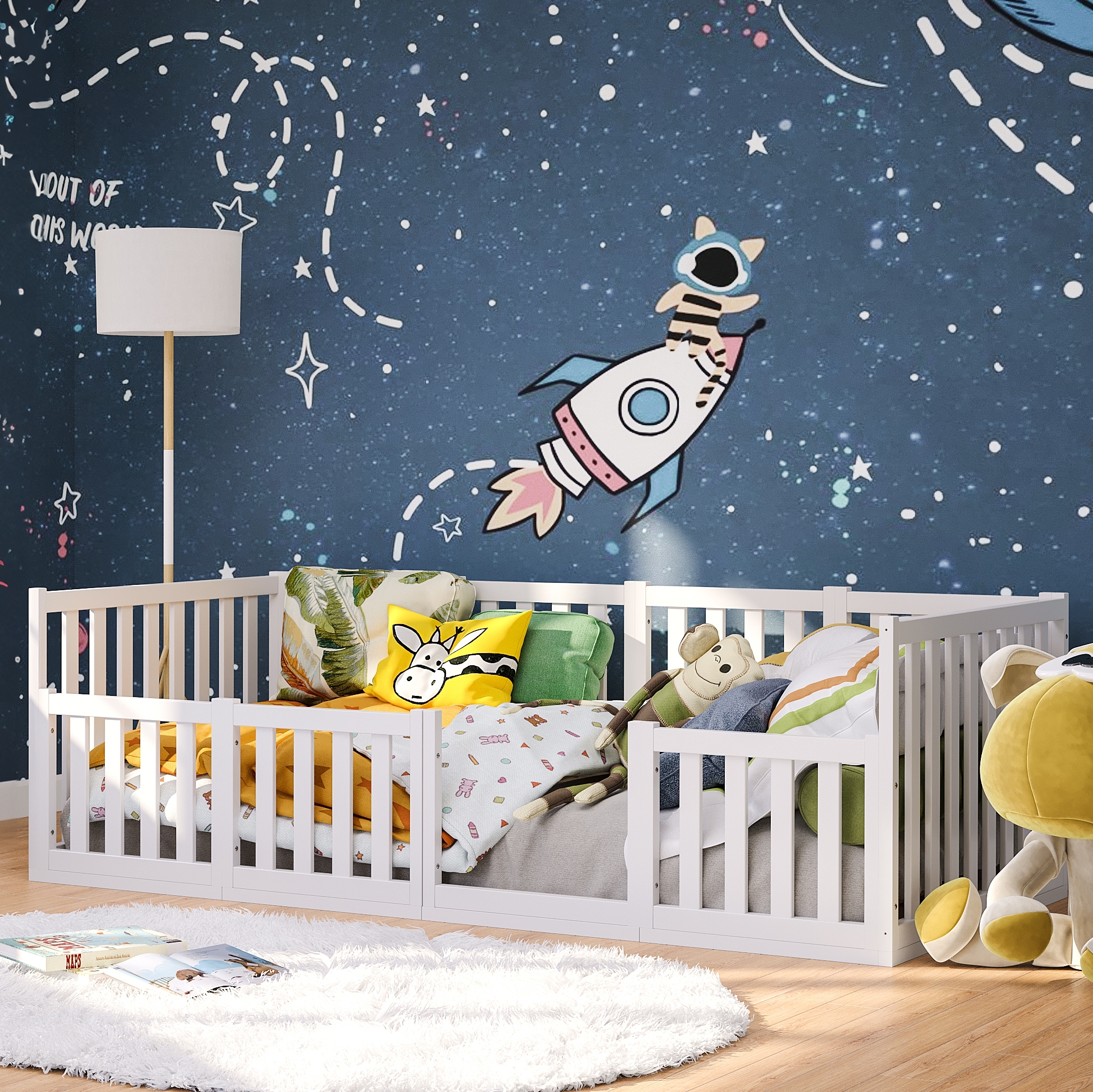 Nach Montessori-Prinzipien entworfen, ist das Bodenbett 'Cuvo' von Bellabino eine praktische Schlafgelegenheit für Kinder, die die Selbständigkeit der Kleinen fördert und unterstützt. Das Kinderbett wird direkt auf dem Boden montiert und weist dadurch eine niedrige Betthöhe auf. Das Kind kann somit 'Cuvo' eigenständig nutzen und ohne die Hilfe von Mama und Papa abends ins Bett gehen und morgens allein aufstehen. Das Kinderbett von Bellabino ist aus robustem Massivholz gefertigt und verfügt über eine geräumige Liegeflache von 90x200 cm, die mit Hilfe des mitgelieferten Lattenrostes eine gemütliche Schlafumgebung bietet. Um die höchste Sicherheit während des Schlafs zu garantieren, ist 'Cuvo' mit einem umlaufenden Rausfallschutz ausgestattet, der dafür sorgt, dass Ihr Liebling vom Bettchen nicht fällt. Der Rausfallschutz bietet zudem eine praktische Öffnung, sodass das Kind mühelos ins Bett und aus dem Bett steigen kann. 'Cuvo' überzeugt zudem durch die robuste Konstruktion: Das Kinderbett ist bis zu 100 kg belastbar und verspricht der spielerischen Energie der Kleinen höchsten Widerstand. Das minimalistische Design im Skandi-Stil fügt sich zudem nahtlos in jedes Kinderzimmer ein: Klare Linien und schlichte Eleganz machen dieses Bett zu einem zeitlosen Schmuckstück. **Produktdetails:** - Maße: H 68,0 cm / 42,8 cm, T 205,5 cm, B 95,5 cm - Liegefläche: 90x200 cm - Material: Massivholz, MDF - Max. Belastbarkeit: 100 kg - Lieferumfang: Bodenbett inkl. Rausfallschutz und Lattenrost