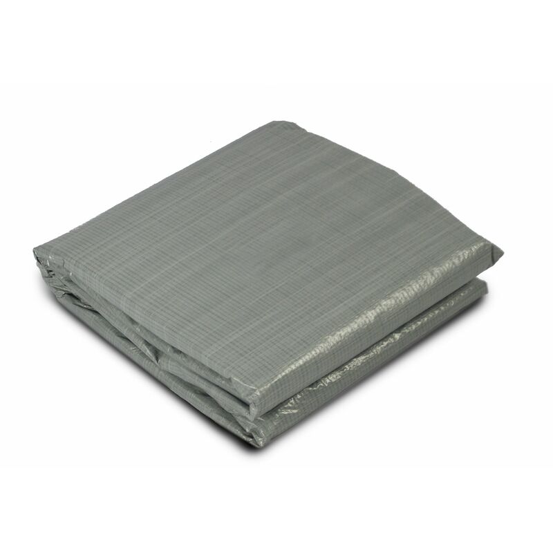 - Die rechteckige graue Bodenplane ist aus robustem Kunststoff hergestellt.