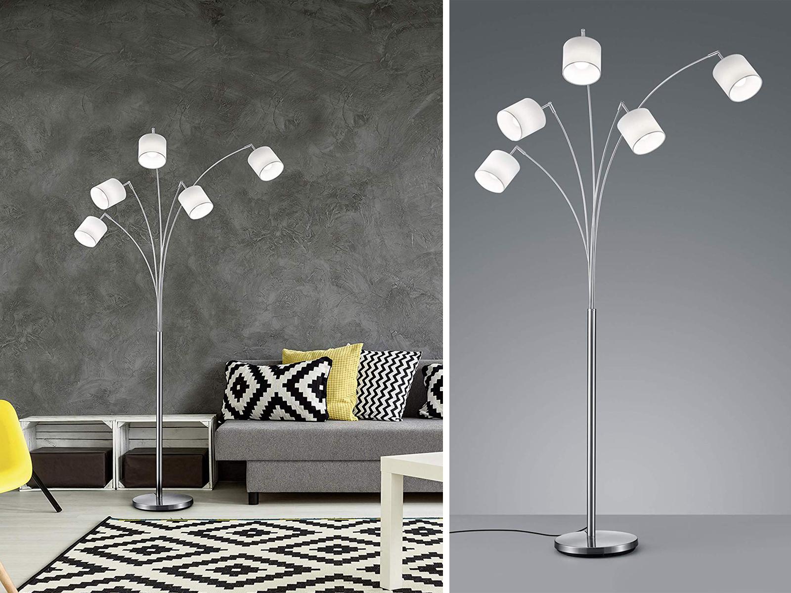 **Die Stehleuchte TOMMY steht für ein wohnliches Licht, da Textilschirme den Behaglichkeitsfaktor erhöhen und ein gemütliches Ambiente zaubern. Zeitgleich zaubern die klaren Formen einen modernen und schlichten Stil, der sich vielseitig einsetzen und kombinieren lässt. Die fünfflammige Leuchte hat eine Höhe von 200 cm und lässt dunkle Ecken in neuem Glanz erstrahlen. Sie dient ideal als unterstützende Lichtquelle und findet in modernen Wohnräumen einen Platz. Die schwenkbaren Köpfe lassen sich zudem gezielt ausrichten, um einzelne Bereiche bewusst in Szene setzen. Die Leuchte ist aus Metall in Nickel matt hergestellt und wird durch fünf weißen Stoffschirme ergänzt. Die Kombination schafft moderne und stilvolle Lichtakzente und verleiht Wohnräumen einen angenehmen Wohlfühleffekt. Für eine energiesparende Beleuchtung empfiehlt sich die Verwendung eines LED Leuchtmittels. Diese sind eine optimale Alternative zu herkömmlichen Halogen Leuchtmitteln und stehen für eine hohe Lichtqualität und eine Energieeinsparung von bis zu 80%. Zusätzlich profitieren Sie bei LED Leuchtmitteln von einer langen Lebensdauer, einer geringen Wärmeentwicklung und schonen gleichzeitig die Umwelt.** **Ausführung** Material: Metall/Stoff Farbe: Nickel matt/Stoff weiss 5xE14 max.28W Stoffschirm **Maße** Höhe: 200cm **Lieferumfang** 1 Bogenleuchte ohne Leuchtmittel **Hinweis** Für den Betrieb sind 5 Leuchtmittel für Fassung E14 erforderlich. Diese Leuchtmittel sind im Lieferumfang nicht enthalten