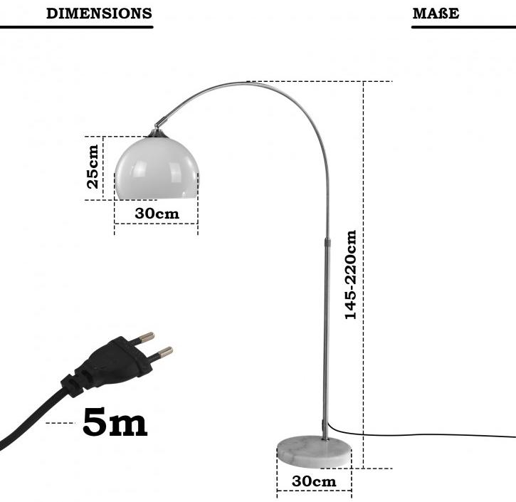 Jago® Bogenleuchte - Höhenverstellbar145-220 cm, 1 x E27, max. 60W / LED, Weiß, für Wohnzimmer, Lounge, Bar - Bogenlampe, Stehlampe, Stehleuchte, Standleuchte, Bogenstandleuchte