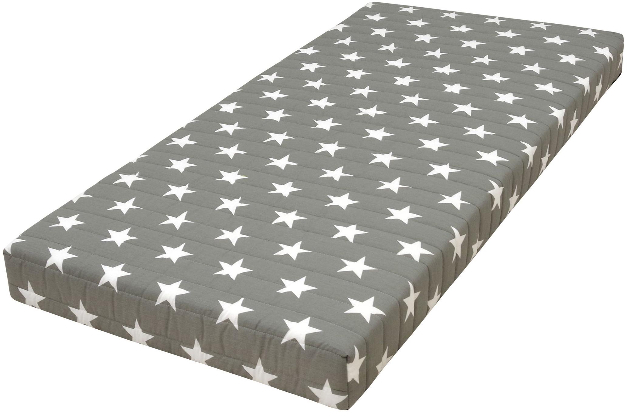 **Ausführung Bezug:** Stoff 40242-710 in grau mit Sternen aus 52% Polyester und 48% Baumwolle **Härtegrad:** H2 **Ausstattung** Kern ca. 11 cm Bonell-Federkern, 2,2 mm Drahtstärke Polsterung der Liegefläche mit ca. 2 cm PU-Komfortschaum 22 kg/m³ und Druckverteiler aus Filz Polsterung der Unterseite mit Filzplatte Oberstoff Druck-Muster: Grau mit Sternen Versteppt mit 150 g/m² Polyesterklimafaser Unterseite: Non Woven/PP-Spinnvlies, unversteppt Matratze nicht wendbar Aufmachung Liegefläche versteppt mit Polyester-Klimafaser **Lieferumfang** 1 Bonell-Federkernmatratze ohne Dekoration / Bett
