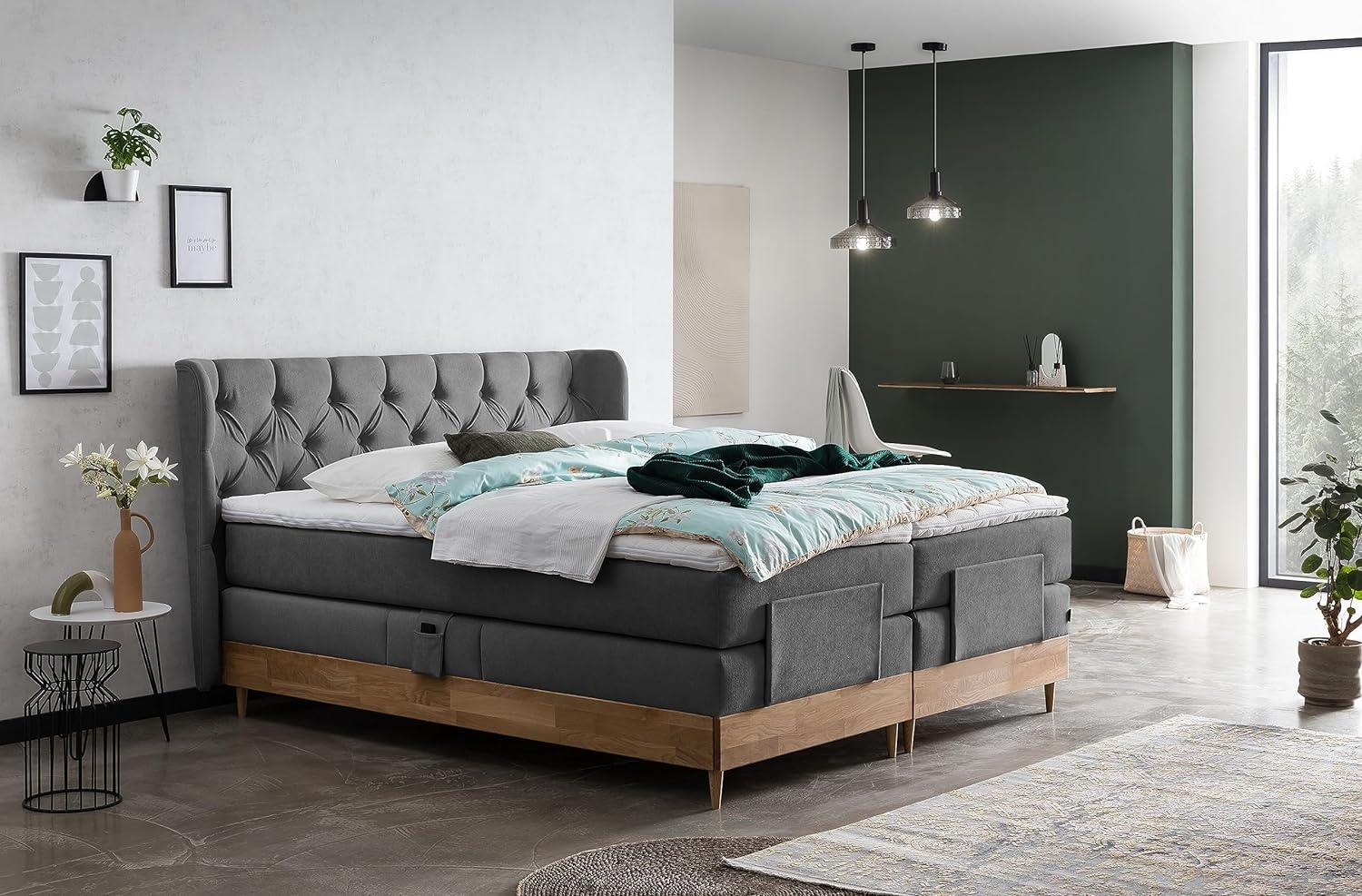 in BoxspringbettenBelanoti EON Boxspringbett 160x200 elektrisch verstellbar 7-Zonen Taschenfederkern Matratze inkl Visco Topper Bett 160x200 mit Motor in der Farbe Anthrazit H2/H3 Polsterbett Motorbett Massivholz Eiche