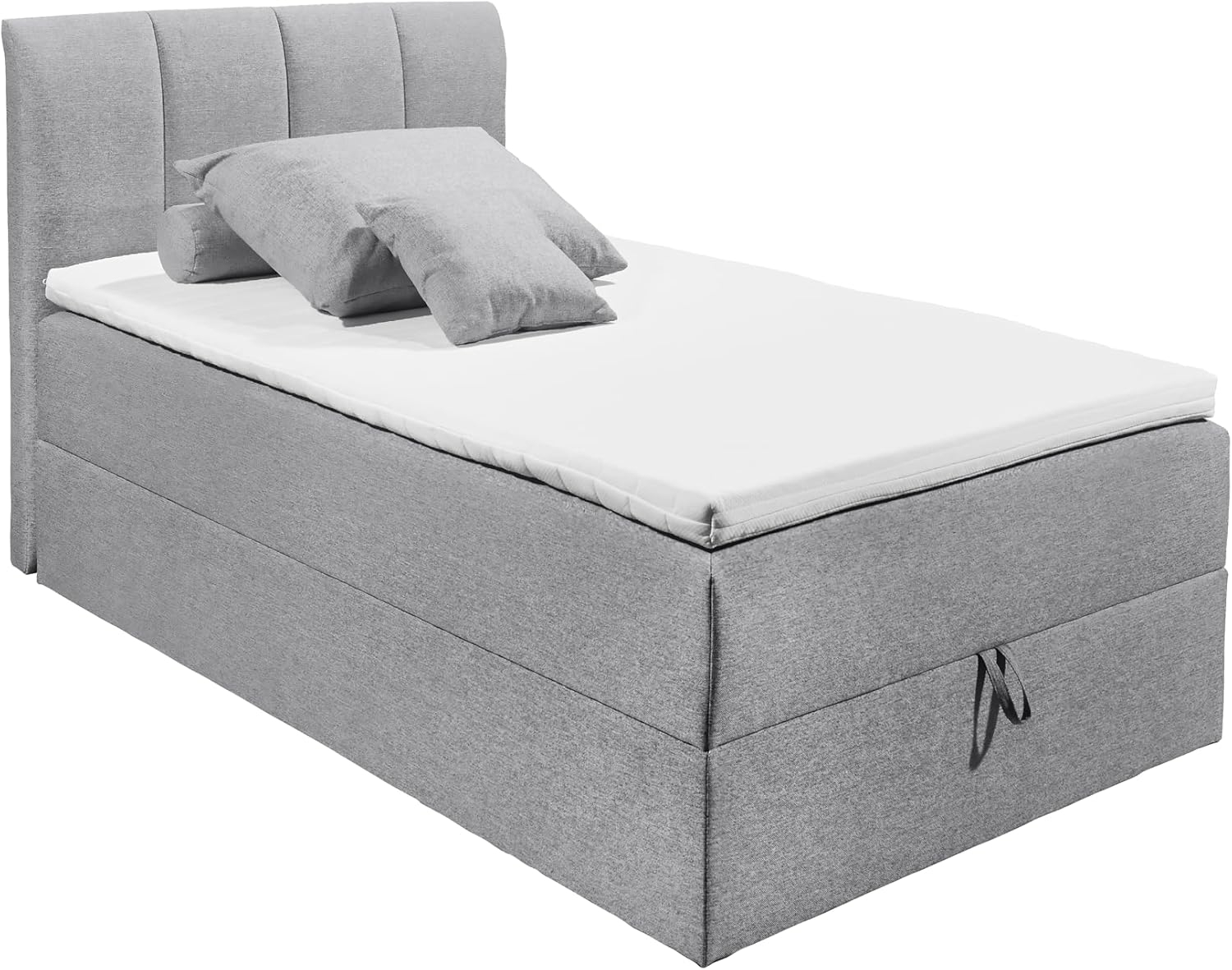 **Ausführung** **Bezug:** Stoff Colet 06 in der Farbe grau aus 100% Polyester **Box:** stabiles, hochwertiges Gestell aus Holzwerkstoffen Obermatratze: 9-Zonen-Tonnentaschenfederkern, 1 Lage mit ca. 2 cm Schaum T25 **Topper:** Komfort T25 Schaum-Topper **Liegeempfinden:** mittel Härtegrad 2 **Füße:** Kunststoff **Ausstattung** 1 gepolstertes Kopfteil mit attraktiver Längssteppung 1 Box mit Bettkasten 1x9-Zonen-Tonnentaschenfederkern-Matratze 1 T25 Schaum-Topper, Bezug waschbar bis 40° Lieferumfang 1 Polsterbett ohne Dekoration / Kissen