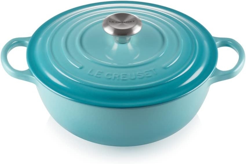 Der Le Creuset Gusseisen Signature La Marmite mit einem Durchmesser von 26 cm in der Farbe karibik ist der ideale Bräter für köstliche Gerichte. Hergestellt aus hochwertigem Gusseisen, sorgt er für eine gleichmäßige Hitzeverteilung und hält Ihre Speisen lange warm. Der dicht schließende Deckel bewahrt die Feuchtigkeit, während die robuste Verarbeitung eine lange Lebensdauer garantiert. Perfekt für alle Herdarten und den Backofen geeignet, ist dieser Bräter ein unverzichtbares Küchenutensil. **Highlights** - Lässt kaum Feuchtigkeit entweichen: Der dicht schließende Deckel hält mehr Feuchtigkeit im Bräter. - Gerichte bleiben länger warm: Das Gusseisen speichert die Hitze optimal. - Gleichmäßige Hitzeverteilung: Sorgt für perfekte Garergebnisse. - Hochwertige Verarbeitung: Ein echter Blickfang in Ihrer Küche. - Lange Lebensdauer: Robustes Material für langanhaltende Freude. **Produkteigenschaften** - Material: Gusseisen - Farbe: karibik - Durchmesser: 26 cm - Fassungsvermögen: 4,1 l - Abmessungen (L x B x H): 34,8 x 27,5 x 16,1 cm (mit Deckel und Griffen) - Hitzebeständig: Bis 250 °C - Geeignet für alle Herdarten: inklusive Induktion - Spülmaschinenfest: Reinigung von Hand empfohlen - Made in France: Hohe Qualität und traditionelle Handwerkskunst **Lieferumfang** - 1x Le Creuset Signature Gusseisen-Bräter mit Deckel, Ø 26 cm - Maße mit Griffen und Deckel: 34,8 x 27,5 x 16,1 cm - Gewicht: 4,255 kg - Farbe: karibik