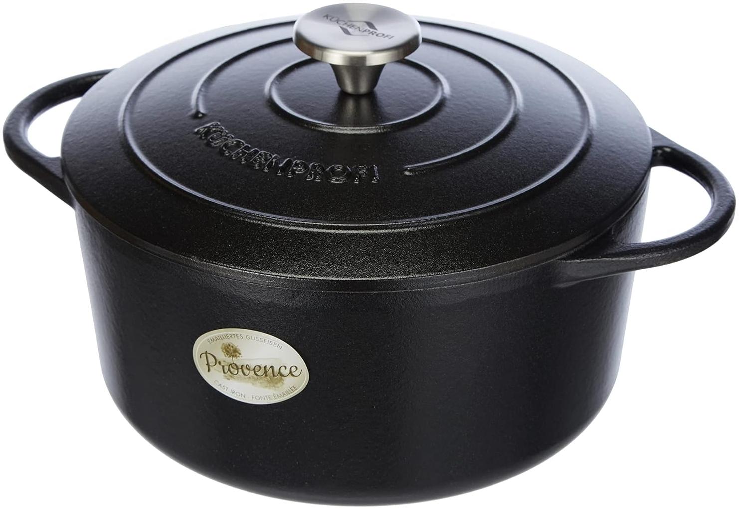 Der Küchenprofi Bratentopf mit Deckel 24cm Provence ist ideal zum Schmoren, Köcheln, Kochen, Braten und Frittieren. Das hochwertige Gusseisen nimmt die Hitze schnell auf und verteilt sie optimal, sodass du die Energiezufuhr reduzieren und Strom sparen kannst. Der Topf ist für alle Herdarten inklusive Induktion geeignet und die Knöpfe sind bis 250°C backofenfest. Das schlichte und durchdachte Design mit handlichen Knöpfen und ergonomischen Griffen macht den Topf zu einem Blickfang auf jeder Tafel. Der Lieferumfang umfasst den Bratentopf mit Gussdeckel. **Highlights** - Ideal zum Schmoren, Köcheln, Kochen, Braten und Frittieren - Gusseisen nimmt Hitze schnell auf und verteilt sie optimal - Energieeffizient und aromaschonend - Für alle Herdarten inklusive Induktion geeignet - Schlichtes und durchdachtes Design **Produkteigenschaften** - Abmessungen: Breite: 31,5 cm, Höhe: 11,5 cm, Durchmesser: 24 cm - Fassungsvermögen: 4,2 ltr. - Gewicht: 4,682 kg - Material: Gusseisen emailliert - Backofenfest bis 250°C **Lieferumfang** - 1x Küchenprofi 24cm Bratentopf rund mit Gussdeckel Schwarz PROVENCE 0401001024