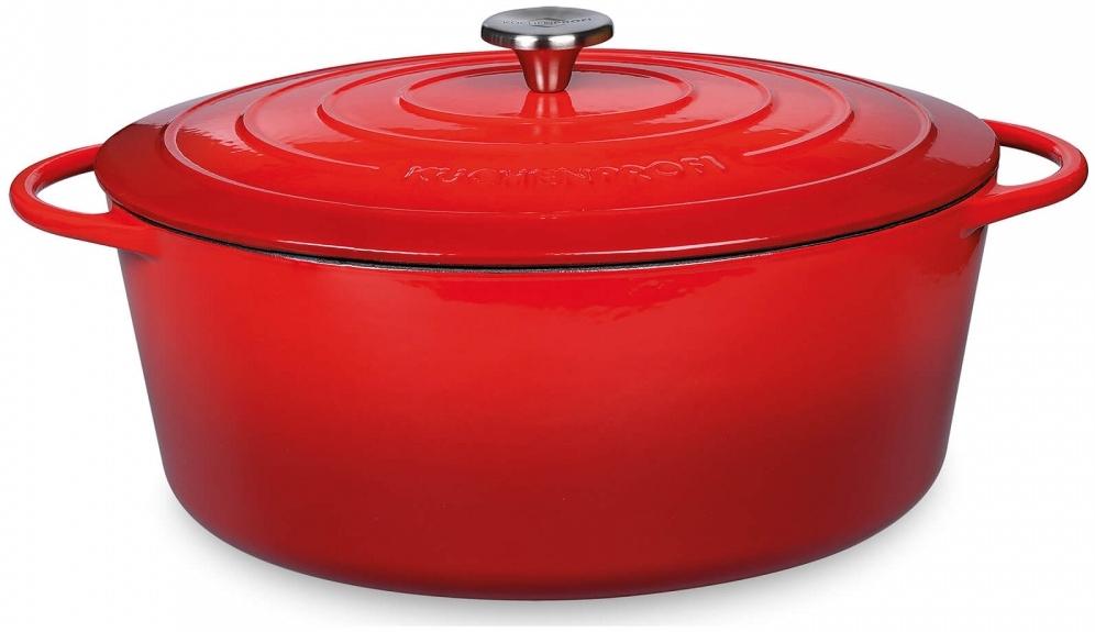 - Der Bratentopf hat eine ovale Form mit einer Länge von 33 cm, die vielseitige Kochmöglichkeiten bietet