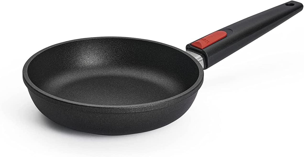 Aluguss, ohne Deckel, ca. 8 mm gegossener Thermoboden für optimale Wärmespeicherung, schnitt- und abriebfeste Titanium-Hartgrundversiegelung, mit abnehmbarem Stiel, backofenfest bis 250° C, hohe Stoßfestigkeit, verstärkter Schüttrand, spülmaschinengeeignet, nicht induktionsgeeignet Ø 20 cm, H 5 cm
