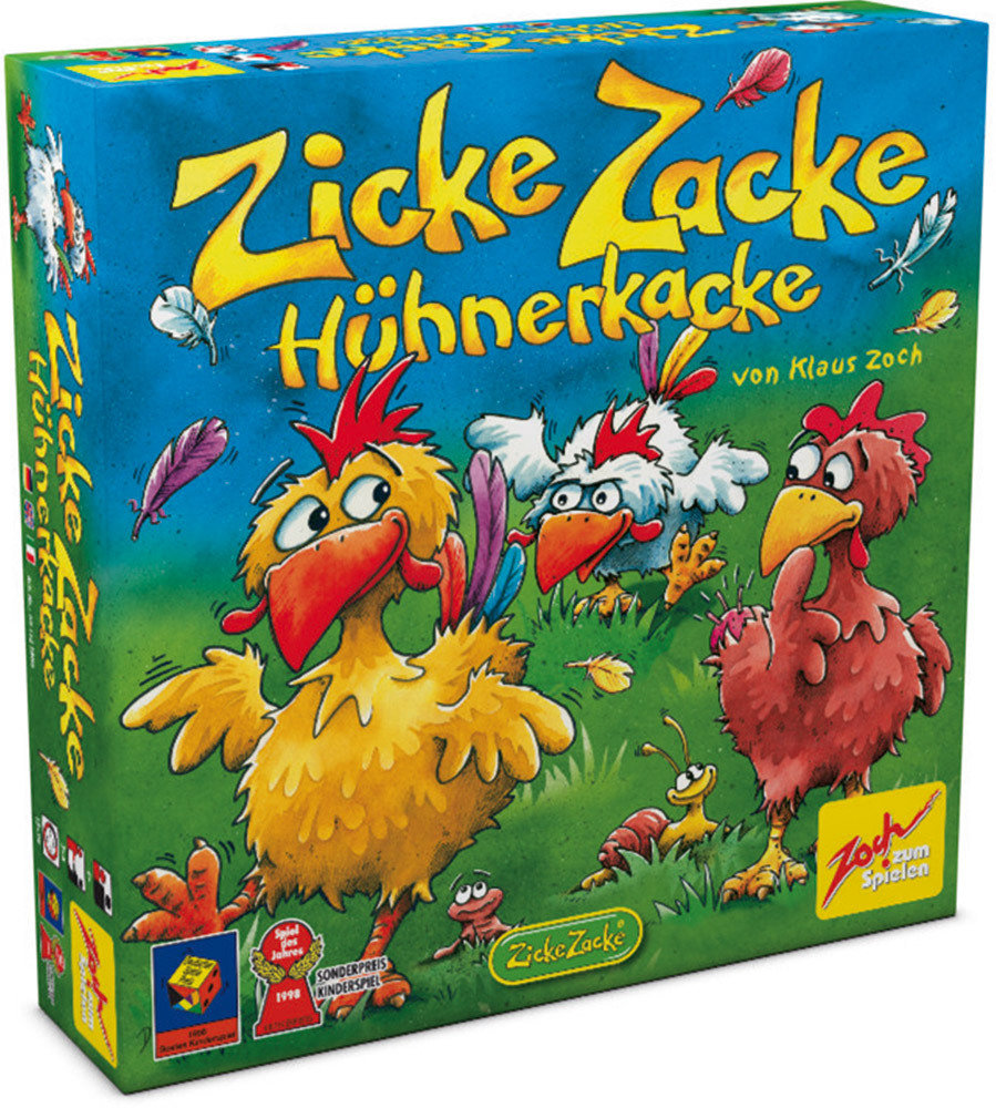 Zicke Zacke Hühnerkacke Der mehrfach preisgekrönte Klassiker unter den besten Kinderspielen! Ziel des Spiels ist es, sich mit den Federn der anderen Hühner zu schmücken. Das eigene Huhn vorwärts bewegen darf, wer das vor ihm liegende Bildmotiv im Hühnerhof aufdeckt. Überholt ein Huhn ein anderes Huhn, darf es diesem alle Federn ausrupfen und sich selbst einstecken. Die rasante Hühnregedächtnisrallye feiert im Jahr 2013 ihren 15. Geburtstag und begeistert bald schon die Kinder der ersten Kinder, die mit ihr groß wurden. Auszeichnungen: Spiel des Jahres 1998: Sonderpreis Kinderspiel Deutscher Spielepreis: Bestes Kinderspiel 1998 Inhalt:24 eierförmige Wegplättchen12 achteckige Hühnerhofplättchen4 Hühner aus Holz4 Schwanzfedern aus Holz1 Spielanleitung Warnhinweis: Achtung! Nicht für Kinder unter 36 Monaten geeignet Achtung! Enthält verschluckbare Kleinteile. Erstickungsgefahr. Bei Sortimenten und Großpackungen gilt der angegebene Preis pro Stück. Eine Auswahl ist nur bedingt möglich!