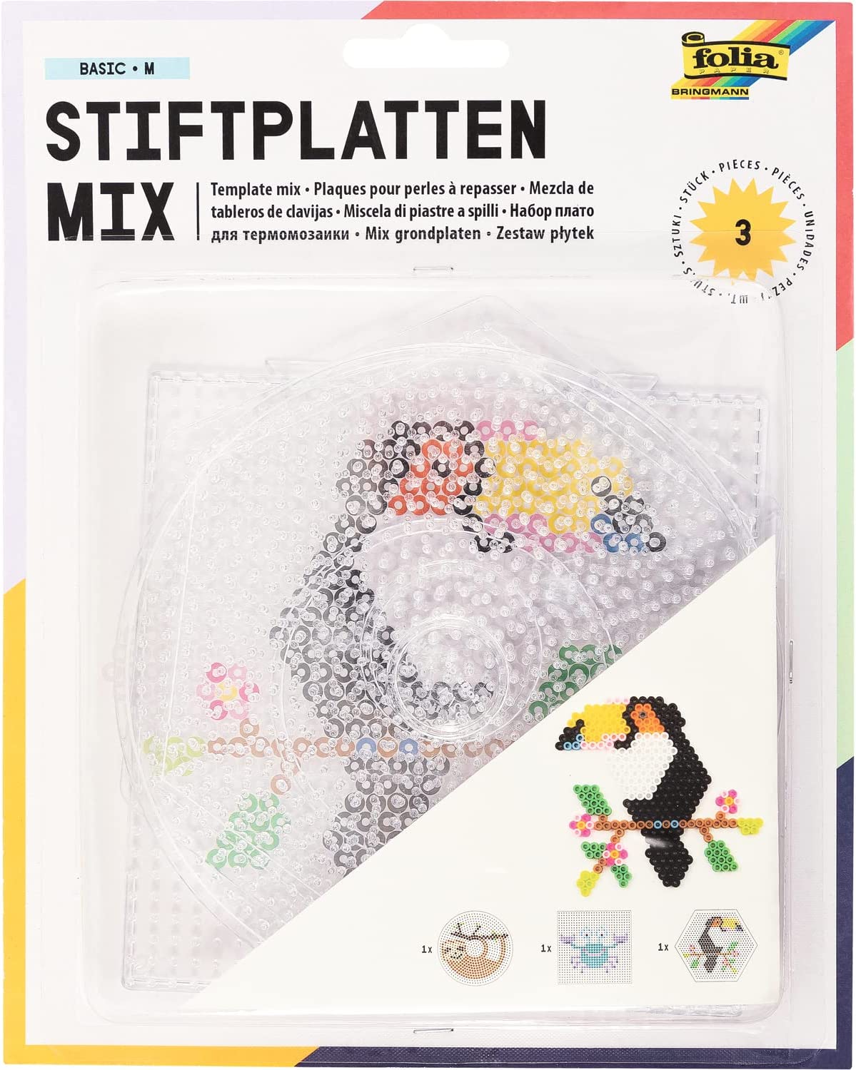 | Name | folia 73214 - Bügelperlen Stiftplatten Set Basic groß, 3 transparente Steckplatten für Bügelperlen mit einem Durchmesser von 5 mm, Kreis, Quadrat und Sechseck |