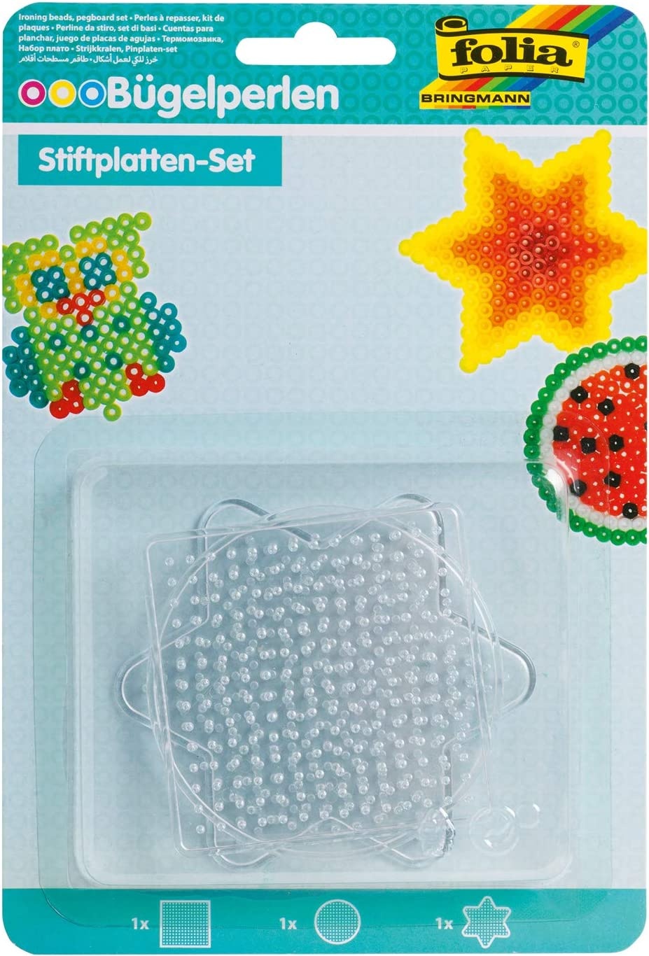 - Das folia 73211 Bügelperlen Stiftplatten Set Basic klein enthält drei transparente Steckplatten in den Formen Kreis, Quadrat und Stern.