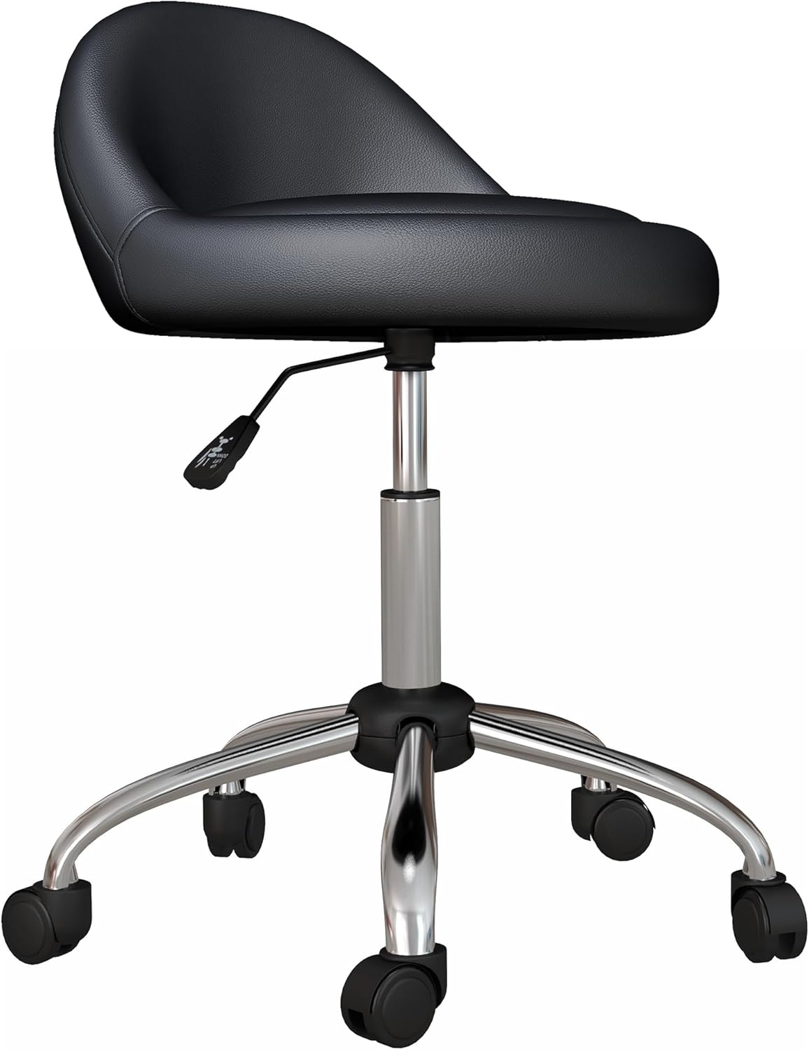 HOMCOM Rollsitz ist ein höhenverstellbarer Arbeitshocker, der sich ideal für verschiedene Arbeitsumgebungen eignet. Mit einer verstellbaren Sitzhöhe von 63-83 cm und einem drehbaren Sitz bietet er Flexibilität und Komfort. Der Bezug aus pflegeleichtem Kunstleder und die gepolsterte Sitzfläche sorgen für ein angenehmes Sitzgefühl. Die fünf Rollen ermöglichen ein müheloses Bewegen im Arbeitsbereich. **Highlights** - Verstellbare Sitzhöhe für unterschiedliche Bedürfnisse - Um 360° drehbarer Sitz für Flexibilität - Gepolsterter Sitz mit hochdichtem Schwamm für Komfort - Robuster Stahlrahmen und verzinkter 3-Klassen-Gaslift für Stabilität - Elegantes Design in Schwarz mit silbernem Stahlsockel **Produkteigenschaften** - Farbe: Schwarz - Material: Kunstleder, Schaumstoff, Mehrschichtplatte - Gesamtabmessungen: Ø50 x 63-83 cm - Sitzgröße: Ø35 x 53-73 cm - Sitzdicke: 8 cm - Rückengröße: 35 x 4 x 18 cm - Belastbarkeit: 120 kg **Lieferumfang** - 1 x Salonhocker - 1 x Handbuch