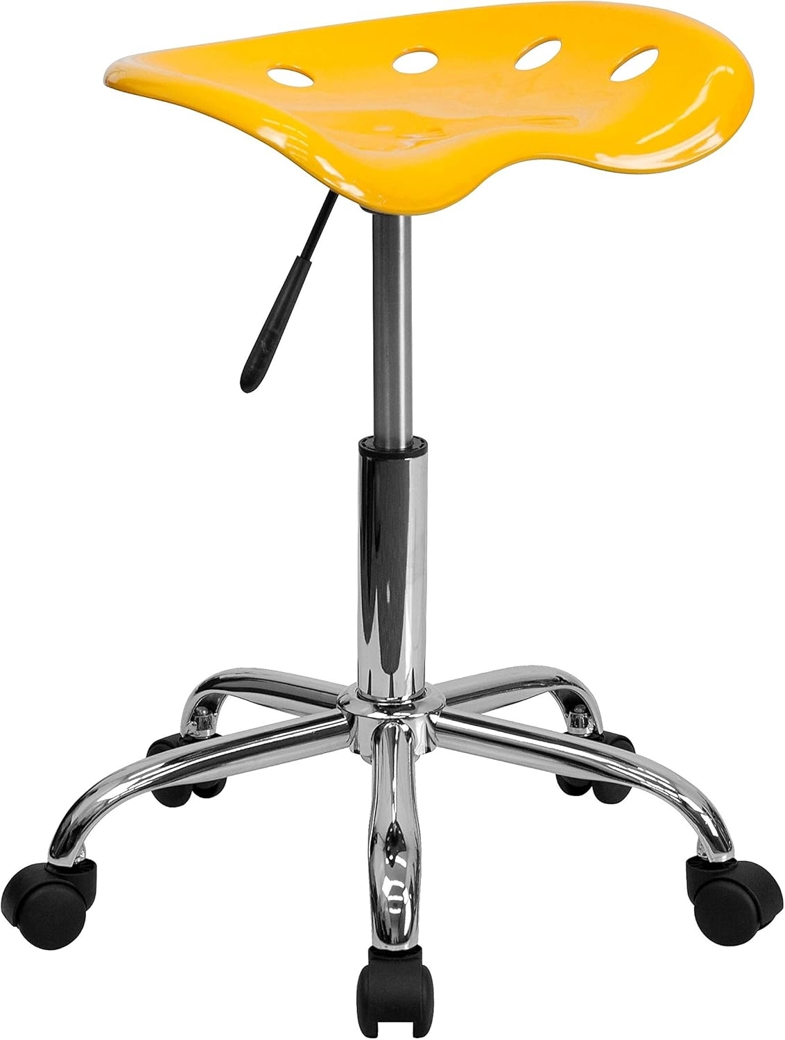 Der Flash Furniture Bürostuhl in Orange-Gelb ist ein farbenfroher Traktorhocker, der Ihnen eine erfrischende Abwechslung vom gewöhnlichen Sitzen bietet. Mit einem 360°-Drehgelenk können Sie sich frei bewegen, während das rückenfreie Design Ihre Bauchmuskeln aktiviert. Der komfortabel geformte "Traktor" Sitz und der robuste Chromfuß sorgen für Stabilität. Die pneumatische Sitzhöhenverstellung ermöglicht eine individuelle Anpassung der Sitzposition. **Highlights** - 360°-Drehgelenk für maximale Bewegungsfreiheit - Rückenfreies Design für eine aktive Sitzhaltung - Komfort-geformter "Traktor" Sitz für bequemes Sitzen - Robuster Chromfuß für Stabilität - Pneumatische Sitzhöhenverstellung für individuellen Komfort **Produkteigenschaften** - Gesamtmaße: 43,18 cm B x 38,10 cm T x 51,44-65,41 cm H - Sitzmaße: 43,18 cm B x 38,10 cm T x 51,44-65,41 cm H - Hochdichte Polymerkonstruktion für Langlebigkeit - Doppelrollen für einfache Mobilität - Moderner Trend-Stil für einen stilvollen Look