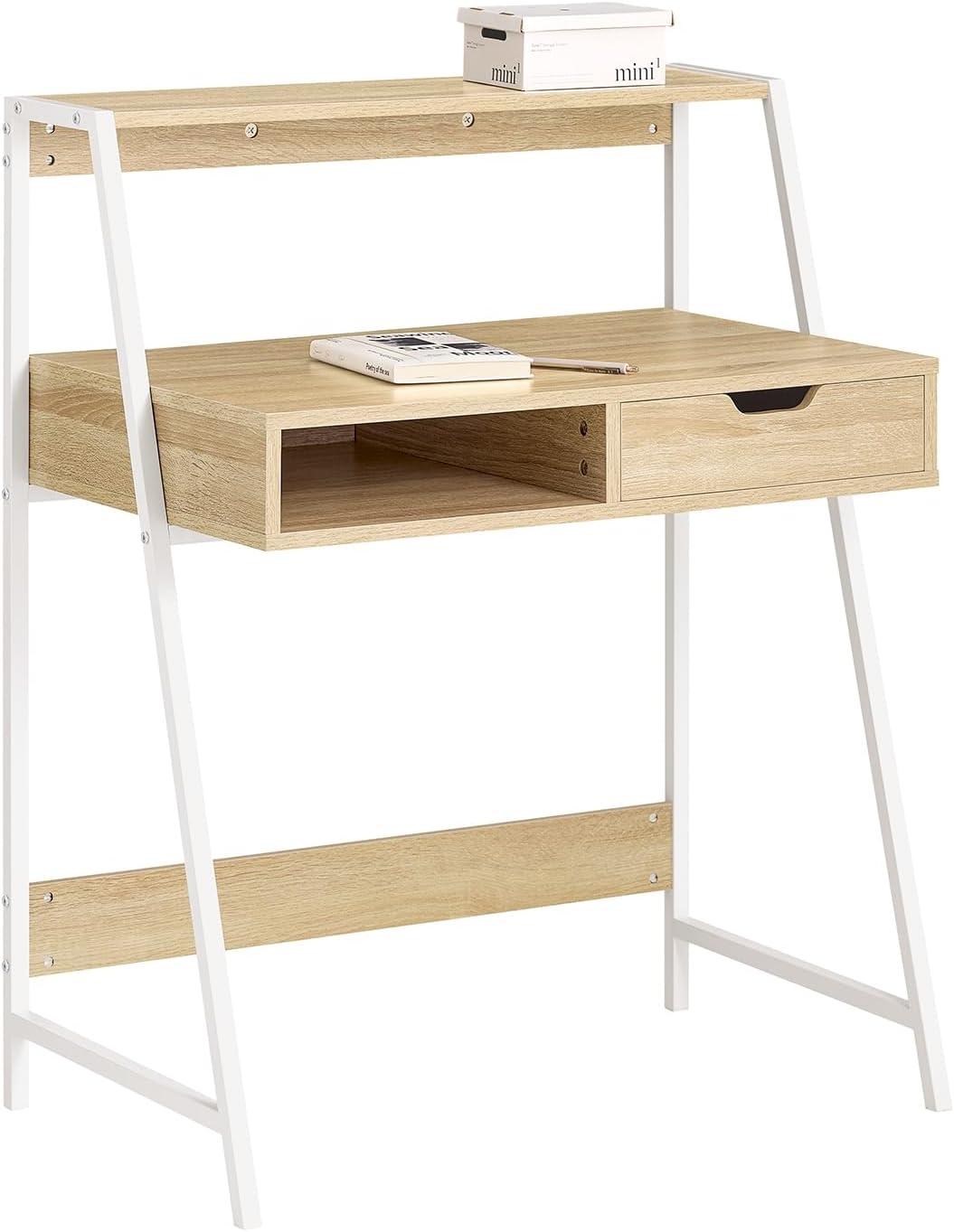 Der FWT63-N Schreibtisch mit Ablage ist ein funktionaler Arbeitsplatz, der Stabilität und ausreichend Stauraum bietet. Mit einem Gewicht von ca. 19,1 kg und einer Belastbarkeit von bis zu 75 kg ist er robust und langlebig. Die Maße betragen ca. 81 x 100 x 50 cm. Der Schreibtisch verfügt über eine praktische Schublade und ein Fach für Ihre Arbeitsutensilien sowie eine Ablagefläche für Bücher und Dekoartikel. **Highlights** - Stabiler und robuster Schreibtisch - Praktische Schublade und Fach für Stauraum - Ablagefläche für Bücher, Pflanzen und Dekoartikel **Produkteigenschaften** - Gewicht: ca. 19,1 kg - Belastbarkeit: bis 75 kg - Material: Span in Natur-Optik, Metallgestell weiß lackiert - Produktmaße: ca. 81 x 100 x 50 cm - Paketmaße: ca. 112 x 13 x 56 cm **Lieferumfang** - 1x FWT63-N Schreibtisch mit Ablage