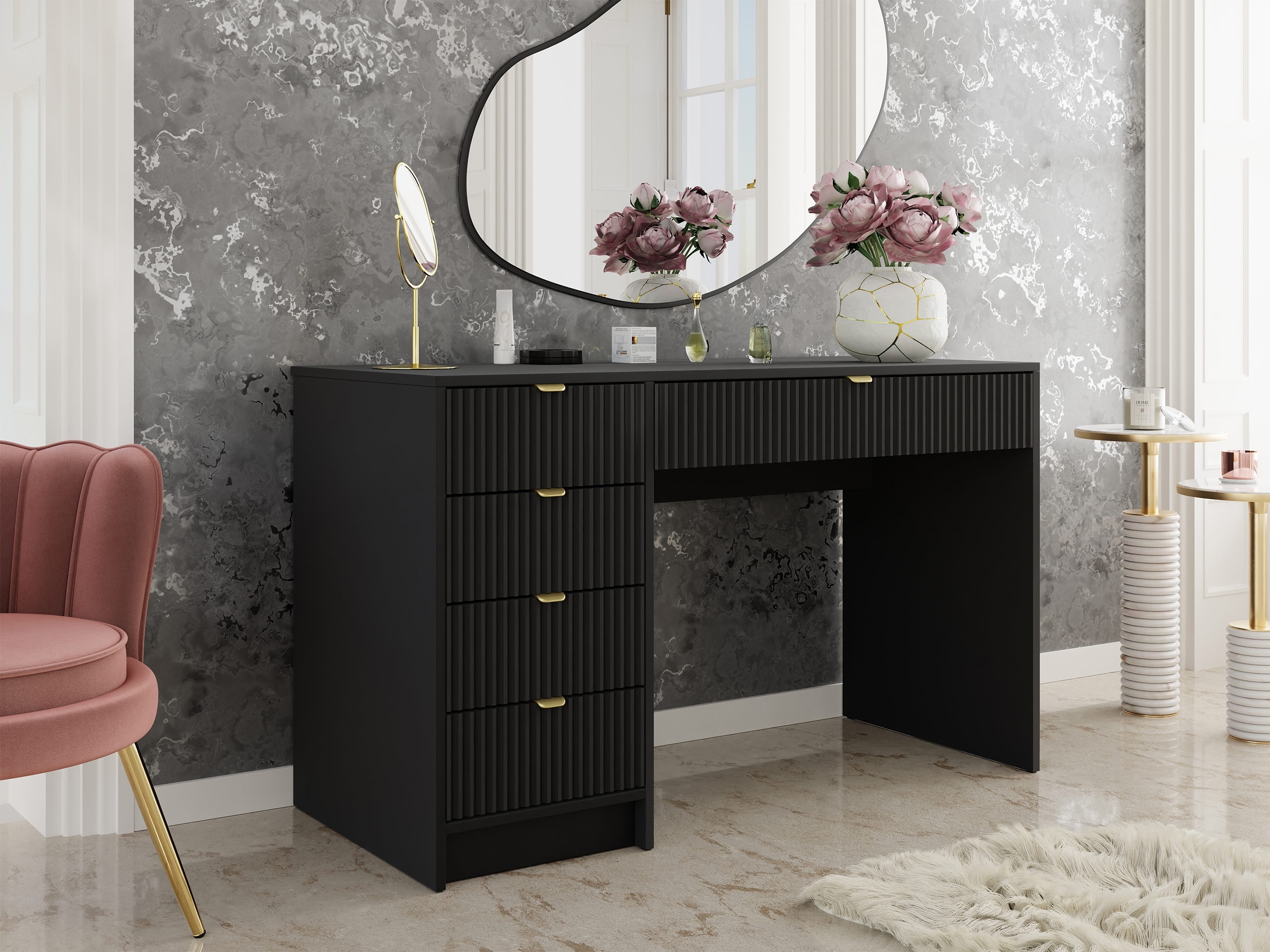 **Schreibtisch und Schminktisch Tireno** **Maße:** - Breite: 120 cm, - Höhe: 76 cm, - Tiefe: 55 cm. Alle Maße sind ca. Maße. **Lieferung:** - Die Möbel werden in Paketen mit Montageanleitung zum Selbstaufbau bis zur ersten Tür geliefert. - Geliefert wird nicht auf Insel und Bergbewohnung. **Farbkombination:** - Die Farben unserer Grafik können vom Original abweichen. **Ausführung:** - Korpus: Laminatplatte 16 mm, - Fronten: MDF-Platte 16 mm, - Rücken aus HDF-Platte, - ABS und Melamin Kante, - Aluminiumgriffe in der Farbe Gold, - Kugelgleitschienen, - Antirutschfüße, - Schreibtisch ist universell - Links / Rechts, **(Löcher hierfür müssen selbst gebohrt werden)** - Spiegel ist nicht im Set enthalten. **Zusatzinformation:** - ohne Dekoration.