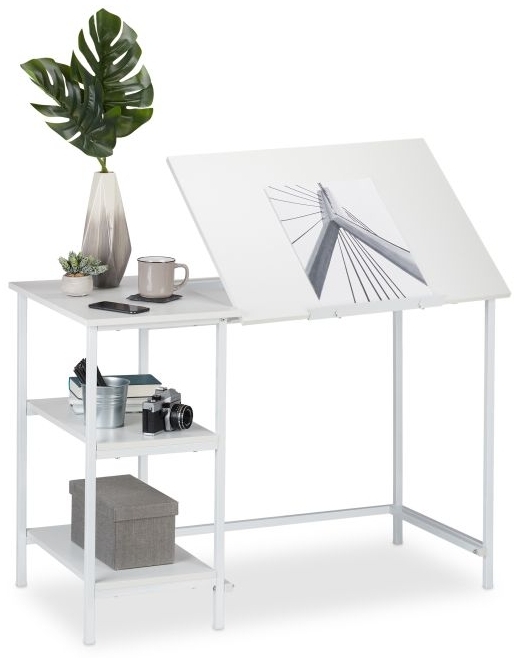 Der Relaxdays Schreibtisch ist ein vielseitiger Arbeitsplatz mit einer stufenweise verstellbaren und neigbaren Arbeitsfläche. Mit seinen Abmessungen von ca. 75 x 110 x 55 cm und dem modernen Design in Weiß fügt er sich ideal in jedes Home Office oder Büro ein. Drei Ablagen an der linken Seite bieten praktischen Stauraum für Büro- und Zeichenmaterial, während die neigbare Oberfläche für optimalen Komfort sorgt. **Highlights** - Stufenweise verstellbare Arbeitsfläche für individuellen Komfort - Neigbarer Tisch für vielseitige Nutzungsmöglichkeiten - Drei Ablagen für geordneten Stauraum - Platzsparende Größe für jede Umgebung - Modernes Design mit weißer Arbeitsfläche und Beinen **Produkteigenschaften** - Abmessungen: H x B x T: ca. 75 x 110 x 55 cm - Farbe: Weiß - Material: MDF und Metall - Maximale Traglast Tischplatte: 55 kg - Maximale Traglast Erhöhung: 10 kg - Gewicht: ca. 16,5 kg - Arbeitsfläche Maße B x T: ca. 72 x 55 cm - Anti-Rutsch-Vorrichtung: ca. 36 cm breit - Obere Ablage Maße B x T: ca. 38 x 55 cm - Untere Ablagen Maße B x T: ca. 30 x 51,5 cm - Abstand untere zur mittleren Ablage: ca. 30,5 cm - Abstand mittlere zur oberen Ablage: ca. 28 cm - Höhe unterste Ablage: ca. 12,5 cm - Verstellbar bis zu einem Winkel von ca. 31,9° **Lieferumfang** - 1x Schreibtisch neigbar in Einzelteilen - Aufbau-Anleitung - Dekoartikel sind im Lieferumfang nicht enthalten