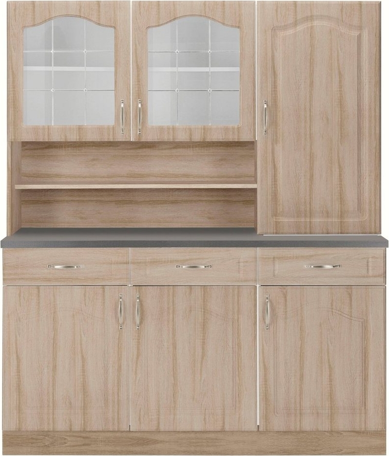 Das Küchenbuffet »Linz« von Wiho Küchen vereint stilvolle Landhaus-Optik mit praktischer Funktionalität. Mit einer Breite von 150 cm bietet es ausreichend Stauraum für Geschirr, Gläser und Dekoartikel. Geschlossene Türelemente, Schubfächer und Vitrinentüren sorgen für eine ansprechende Optik. Die höhenverstellbaren Einlegeböden ermöglichen eine individuelle Anpassung der Fächer. Die MDF-Fronten und die passende Arbeitsplatte runden das hochwertige Design ab. **Highlights** - Attraktive Landhaus-Optik - Geschlossene Türelemente und Vitrinentüren - Höhenverstellbare Einlegeböden - Geräumige Fächer für Geschirr und Dekoartikel - Hochwertige MDF-Fronten **Produkteigenschaften** - Breite: 150 cm - Kombination aus Schubfächern, offenem Regal und Vitrinentüren - Passende Arbeitsplatte als Kontrast zu den Schränken
