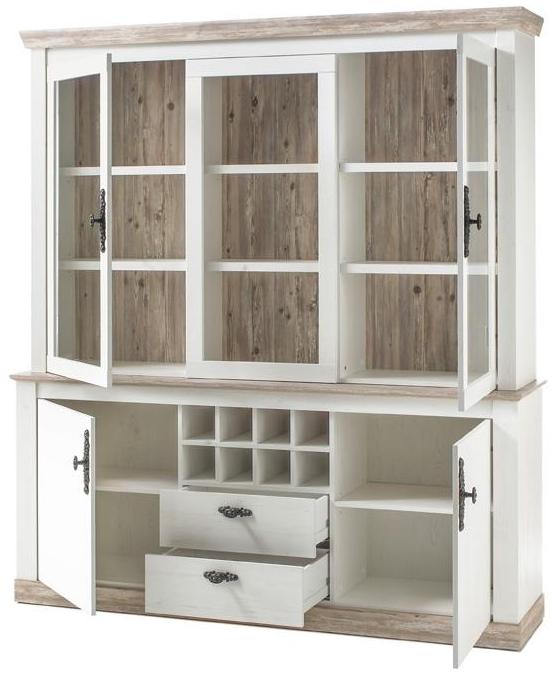 Das tolle Design im modernen Landhaus-Stil und der Stauraum machen dieses Buffet in zu einem Blickfang. Der Vitrinenschrank aus dem Programm FLORENZ hat eine sehr mächtige Wirkung. Die Details werden durch die schwarzen Metallgriffe unterstrichen. Die zwei Glas- zwei Holztüren, drei Fächer, zwei Schubkasten und acht Flascheneinteilungen. Ihrem Esszimmer wird dieser Schrank ein besonderes Feeling verleihen. **Ausführung**: 1x Buffet FLORENZ **Material**: Holzspanwerkstoff Front und Korpus: Pinie weiß, Dekor Absetzungen: Oslo Pinie, Dekor 2x Holztür 2x Glastür 2x Schubkasten 8x Flascheneinteilung 3x Fach Griffe: Metall, schwarz Zerlegte Ware. Eine bebilderte Aufbauanleitung für die Endmontage liegt bei. **Maße**: B/H/T: ca. 184/205/37-44 cm **Lieferumfang:** Originalverpackte Neuware Angebot ohne Beleuchtung, Beimöbel und Dekoration Wir bitten Sie zu beachten, dass die Farbdarstellungen der Produktbilder auf ihrem Monitor abweichen können und nicht verbindlich sind.