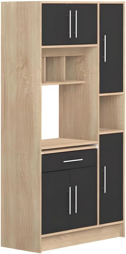 Der **Küchenbuffetschrank MADY** ist mit ausreichend Stauraum ausgestattet, sodass Sie Ihr Geschirr und Ihre Küchenutensilien problemlos unterbringen können. Besonders praktisch ist die herausziehbare Arbeitsplatte, sowie das große Regalfach passend für Ihre Mikrowelle. Produktdetails **Küchenbuffet MADY**: - Material: Spanholzplatten - Aufbau: 5 Türen, 1 Arbeitsplatte zum Herausziehen, 4 Ablageflächen, 1 Schublade, 1 Fach für die Mikrowelle - Farben: Weiß, Weiß & Grau, Weiß & Rot, Weiß & Eiche, Weiß & Betonfarben oder Schwarz & Eiche Ca.-Maße & **Küchenbuffet MADY**: - Maße Küchenbuffet: B 91 x T 40 x H 180 cm - Lieferung bestehend aus 2 Packstücken: - Paket 1: B 187 x T 46 x H 10 cm - Gewicht 34 kg - Paket 2: B 96 x T 46 x H 15 cm - Gewicht: 43 kg **INFO**: **Möbel zum selber montieren gemäß Aufbauanleitung. Aufbauanleitung liegt dem Produkt bei bzw. kann bei unserem Kundendienst erfragt werden.** Hinweise: Für eine reibungslose Lieferung überprüfen Sie bitte die Maße Ihrer Haus- und Eingangstüren sowie die Ihres Treppenhauses. **Ca.-Maße Produkt und Pakete** Küchenmöbel MADY: Produkt: Breite 40 cm, Tiefe 91 cm, Höhe 180 cm, Gewicht 77 kg Paket Nr.1: Breite 187 cm, Tiefe 46 cm, Höhe 10 cm, Gewicht 34 kg Paket Nr.2: Breite 96 cm, Tiefe 46 cm, Höhe 15 cm, Gewicht 43 kg