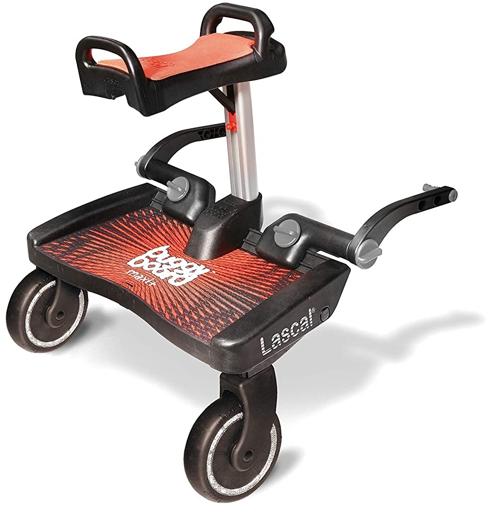 Das Buggy Board Maxi+ besteht aus dem bekannten Buggy Board Maxi und dem Buggy Board Saddle und ist nur im Set erhältlich. Die Abmessungen und Eigenschaften sind die gleichen, wie vom Buggy Board Maxi bzw. dem Buggy Board Saddle. Allerdings unterscheiden sich das Buggy Board Maxi und der Buggy Board Saddle von dem neuen Buggy Board Maxi+ Set in der Art und Weise der Befestigung des Saddles auf dem Buggy Board Maxi. Mit den integrierten und patentierten Lascal EASY-FIT™ Kupplungen passt das Buggy Board Maxi+™ an jeden Kinderwagentyp. Die grosse, Anti-Rutsche Oberfläche mit Sicherheitsrahmen der stabilen und komfortablen Plattform, gibt Ihrem Kind viel Sicherheit. Grosse Räder und eine breite Plattform – viel Platz für Elternfüsse. Schnellverschluss – für schnelles an- und abbauen. Die Max-COMFORT™ Federung ermöglicht ein komfortables Fahren. Seitenreflektoren für gute Sichtbarkeit. Schnelles hochhängen schafft Platz, wenn nicht in Gebrauch. max. Belastung 20 kg flexible Schnellkupplungen bis 22,5 cm Gestellumfang einfach an Ihrem Kinderwagen an- und abzuhaken einfach in der Breite verstellbar (31 – 54 cm) einfach in der Höhe verstellbar (max. 35 cm Höhe) einfach in der Länge verstellbar (33 – 44,5 cm) Anti-Rutsch Standfläche leicht hochklappbar mit Laufrollenfederung große Räder, viel Fußfreiheit (15 cm) Saddle ist schnell zu montieren und demontieren Saddle ist abklappbar bei Nichtgebrauch
