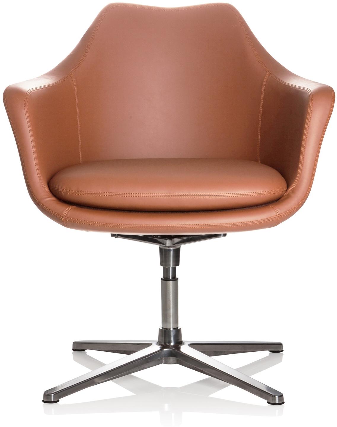 Der hjh OFFICE Loungesessel ARTEMIA aus hochwertigem Kunstleder in Braun vereint stilvolles Lounge-Design mit hohem Sitzkomfort. Die edle Polsterung und die Arm- sowie Rückenlehne bieten optimalen Komfort. Dank der Rückholautomatik kehrt der Sessel nach dem Aufstehen automatisch in die Ausgangsposition zurück. Das Designer-Fußkreuz aus poliertem Aluminium sorgt für Stabilität und Sicherheit. Ideal für Wohnbereiche, Besprechungszimmer oder als Ergänzung zu Ledercouches. **Highlights** - Hochwertiges Kunstleder für eine lange Lebensdauer - Rückholautomatik für einfache Handhabung - Edle Polsterung für hohen Sitzkomfort - Arm- und Rückenlehne für zusätzlichen Komfort - Designer-Fußkreuz aus poliertem Aluminium für Stabilität **Produkteigenschaften** - Farbe: Braun - Maße (H x B x T): 85 x 67 x 63 cm