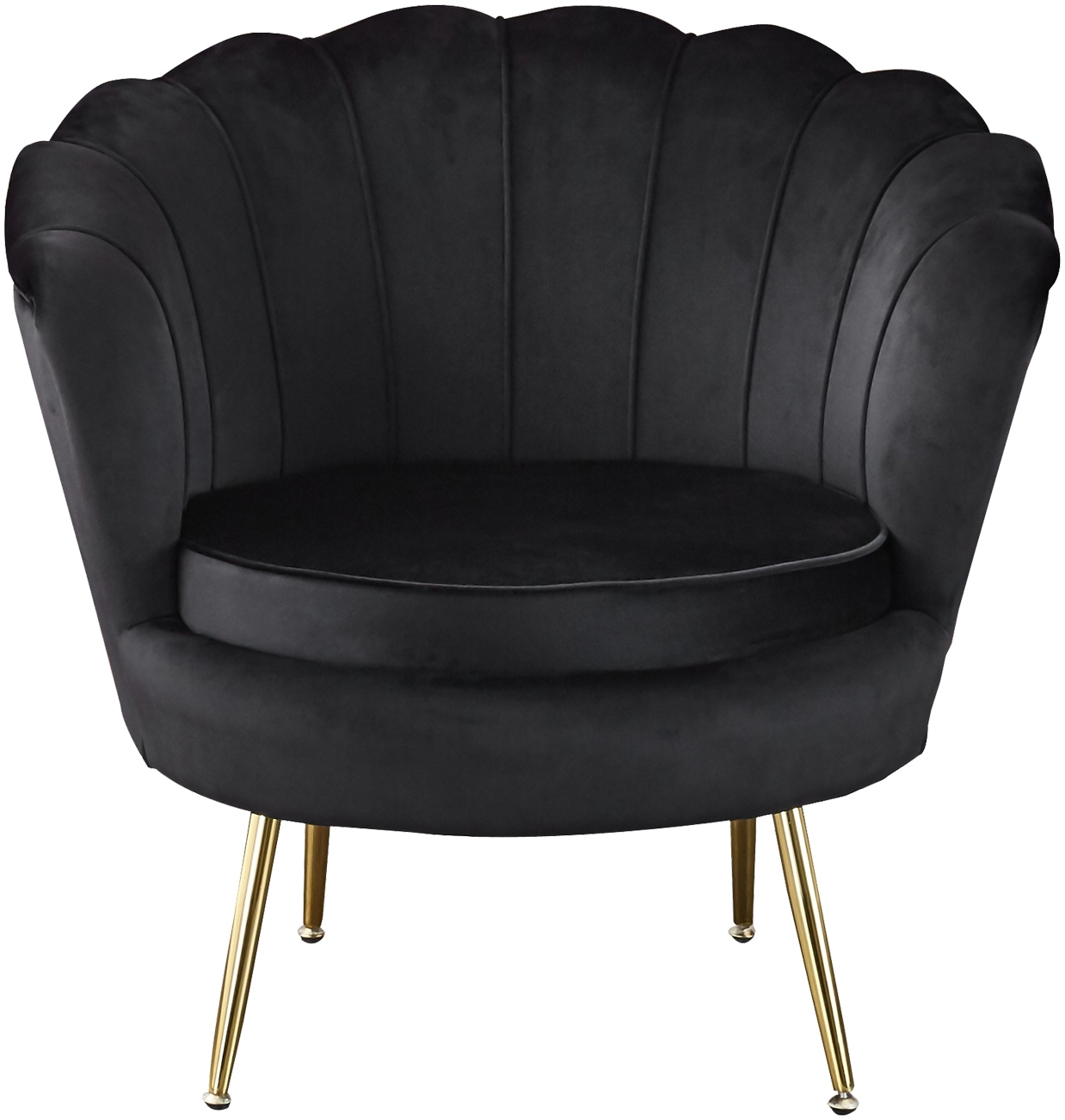 Ein Muschelsessel aus Samt, der Ihrem Wohnzimmer einen zeitlosen Stil verleiht. Der abgerundete Sitz- und Rückenbereich sorgt für höchsten Sitzkomfort. Mit einer Breite von ca. 76 cm, einer Höhe von ca. 78 cm und einer Tiefe von ca. 76 cm bietet der Sessel genügend Platz zum Entspannen. Die Sitztiefe beträgt ca. 56 cm und die Sitzhöhe ca. 44 cm. Der Sessel ist aus Metall und Polyester gefertigt, in der Farbe Schwarz und Gold erhältlich und belastbar bis ca. 150 kg. **Highlights** - Zeitloser Style - Abgerundeter Sitz- und Rückenbereich - Inklusive hohem Sitzkissen **Produkteigenschaften** - Maße: ca. 76 x 78 x 76 cm (B x H x T) - Sitztiefe: ca. 56 cm - Sitzhöhe: ca. 44 cm - Sthulbeinhöhe: ca. 23 cm - Material: Metall und Polyester - Farbe: Schwarz und Gold - Belastbarkeit: ca. 150 kg - Gewicht: ca. 16 kg **Lieferumfang** - 1x Muschelsessel (ohne Dekoration und weiter gezeigte Möbel) - Inklusive hohem Sitzkissen
