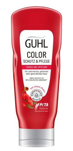 - Die Guhl Color Schutz & Pflege Spülung ist eine feuchtigkeitsspendende Spülung, die die Farbintensität von coloriertem Haar nachhaltig schützt und bis zu 14 Wochen intensive Farbbrillanz schenkt