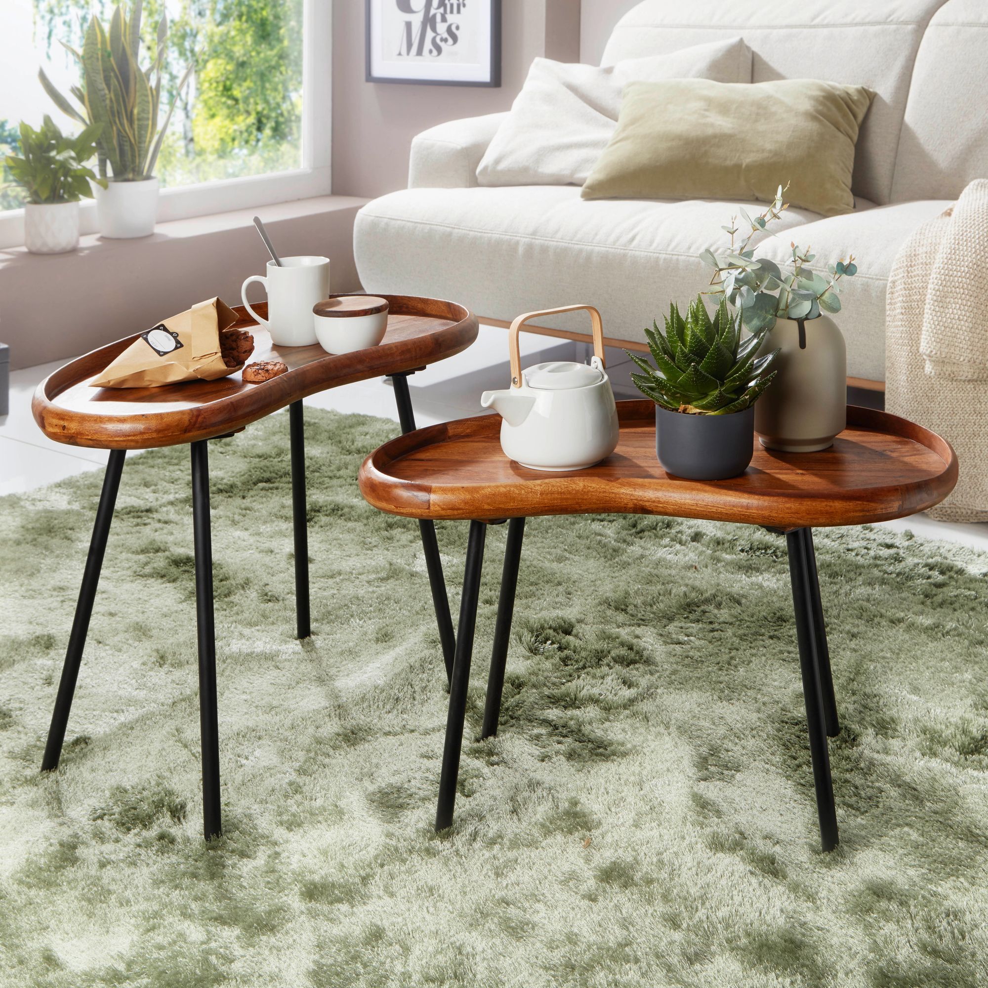 Beistelltisch Set FB52620 aus Sheesham Massivholz in Nierenform mit stabilen Metallbeinen. Dieses 2-teilige Couchtisch Set im angesagten Retro-Design überzeugt durch handgefertigte Qualität und die charakteristische 50er Jahre Form. Die Tische bieten nicht nur einen festen Stand, sondern sind auch ein absolutes Unikat. **Highlights** - 2-teiliges Couchtisch Set im Retro-Design - Tischplatten in typischer 50er Jahre Nierenform - Fester Stand dank stabiler Metallbeine - Handgefertigt und einzigartig - Höhenverstellbare Gumminoppen zum Bodenschutz **Produkteigenschaften** - Großer Tisch: Breite: 71 cm, Höhe: 51 cm, Tiefe: 40 cm, Boden bis Tischunterkante: ca. 46,5 cm - Kleiner Tisch: Breite: 71 cm, Höhe: 42 cm, Tiefe: 40 cm, Boden bis Tischunterkante: ca. 38 cm - Farbe Tischplatten: Braun, Beine: Schwarz - Material Korpus: Sheesham Massivholz, Beine: Metall - Montagezustand: Teilmontiert, Beine müssen angebracht werden **Lieferumfang** - Zwei Couchtische - Ohne Dekoration