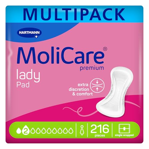 in DamenbindenMoliCare lady Pad 2 Tropfendiskrete Inkontinenzeinlagen für Frauen, dünn, flexibel, ohne Duftstoffe, geruchsneutralisierend, 216 Stück