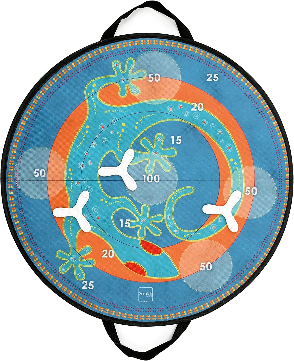 | Beschreibung | Diese magnetische Dartscheibe "Salamander" von Scratch ist ein kurzweiliges, unterhaltsames Spiel und trainiert einige Fähigkeiten. Zudem kommt diese Dartscheibe in einem richtig tollen, kunterbunten und außergewöhnlichen "Salamander" Design. Neben der Magnet Dartscheibe erhalten Sie gleich noch drei kleine Diskusse aus Silikon. Nun kann jeder ab ca. 3 Jahren seine Zielgenauigkeit unter Beweis stellen, denn es gilt, mit dem Diskus die magnetische Dartscheibe zu treffen und dabei natürlich möglichste viele Punkte zu erzielen. Man kann die Scheibe auf den Boden legen oder an der Wand aufhängen. Die Scheibe lässt sich zusammenklappen und kann dann Dank der Griffe auch einfach überall hin mitgenommen werden. |