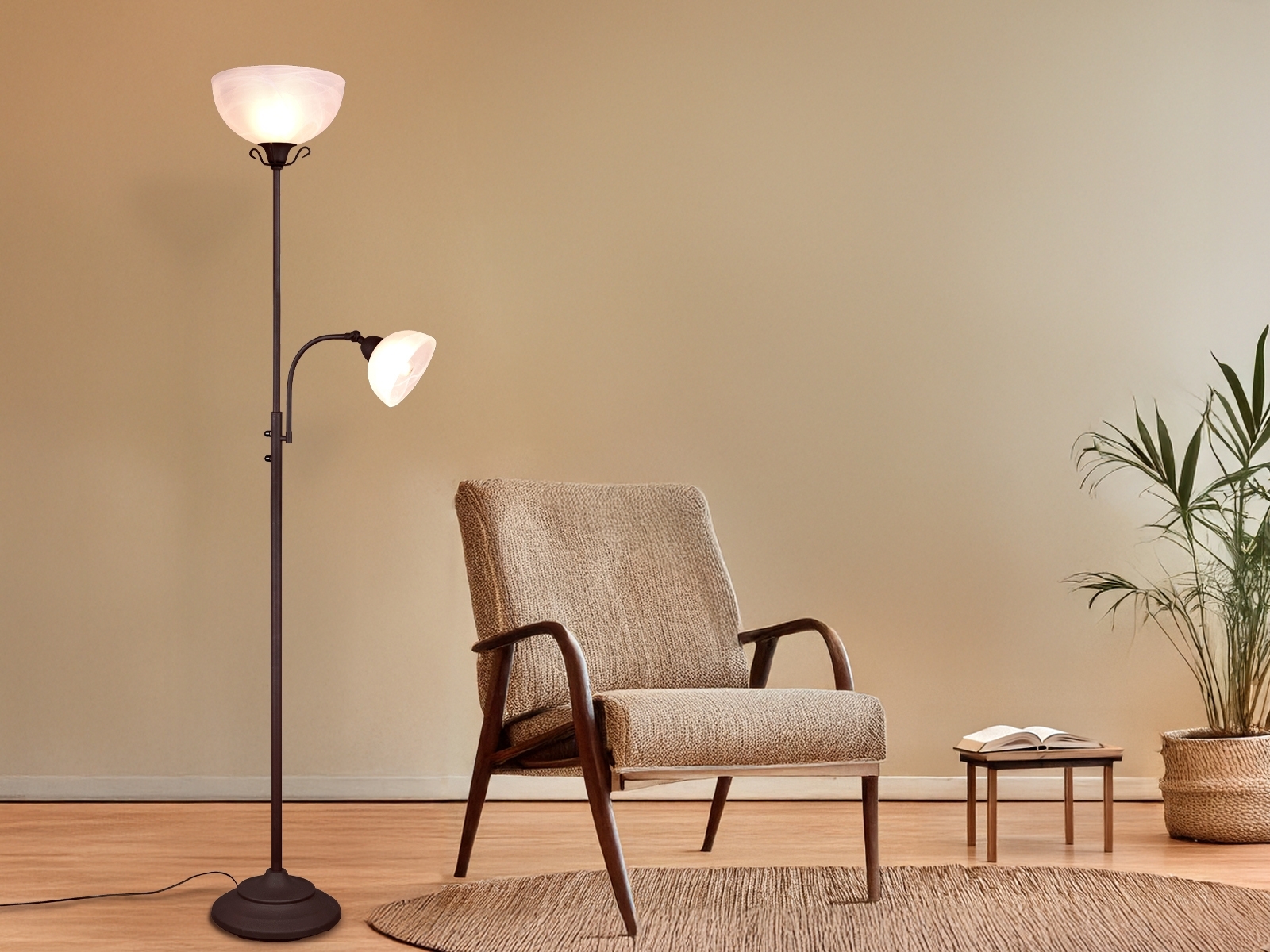 Der große Deckenfluter COUNTRY im Landhausstil kombiniert elegantes Design mit Funktionalität. Hergestellt aus rostfarbenem Metall und ausgestattet mit alabasterfarbigen Glasschirmen, sorgt er für eine gemütliche Atmosphäre. Die flexibel höhenverstellbare Leselampe bietet gezieltes Licht, während der nach oben gerichtete Fluter eine angenehme Grundbeleuchtung schafft. Mit einer Höhe von 184 cm ist dieser Deckenfluter ideal für Wohnräume und Leseecken. **Highlights** - Großer Deckenfluter mit Leselampe - Schlankes und unaufdringliches Design - Rostfarbenes Metall und alabasterfarbiges Glas - Nach oben gerichteter Fluter für gemütliches Licht - Flexibel höhenverstellbare Leselampe **Produkteigenschaften** - Material: Metall, Glas - Farbe: Rost, Alabaster - Höhe: 184 cm - Fassung: E27 (max. 100 Watt), E14 (max. 40 Watt) - Leuchtmittel nicht im Lieferumfang enthalten **Lieferumfang** - 1x Deckenfluter COUNTRY mit Leselampe - Leuchtmittel sind nicht im Lieferumfang enthalten