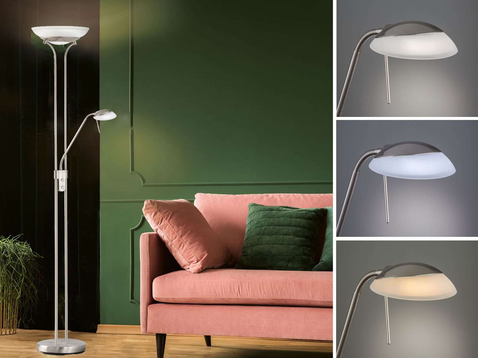 Die Pool Stehleuchte aus Metall in nickelfarbenem matt ist ein stilvolles Highlight für Ihr Zuhause. Mit ihrem alabasterfarbenen Schutzglas und dem satinierten Schaltglas sorgt sie für eine angenehme Atmosphäre. Die Leuchte ist mit einem Sensordimmer ausgestattet und stufenlos dimmbar. Bitte beachten Sie, dass sie nicht für den Nassraum geeignet ist. Die Maße betragen ca. 182 cm in der Höhe und 32 cm im Durchmesser, mit einer Ausladung von 53 cm von der Wand. Im Lieferumfang enthalten ist ein nicht austauschbares LED-Leuchtmittel mit einer Leistung von 28 Watt und einer Lebensdauer von 30000 Stunden. Die Schutzklasse beträgt 2 und die Schutzart IP20. Die Fassung ist für LED-Leuchtmittel geeignet und liefert eine Helligkeit von 2900 Lumen. Die Farbtemperatur ist einstellbar zwischen 2700 Kelvin, 3350 Kelvin und 4000 Kelvin. **Highlights** - Stilvolle Stehleuchte aus Metall in nickelfarbenem matt - Alabasterfarbenes Schutzglas für eine angenehme Atmosphäre - Stufenlos dimmbar mit Sensordimmer - Maße: ca. 182 cm Höhe, 32 cm Durchmesser, 53 cm Ausladung von der Wand - Inklusive nicht austauschbarem LED-Leuchtmittel mit 28 Watt und 30000 Stunden Lebensdauer **Produkteigenschaften** - Material: Metall - Farbe: nickelfarben matt - Glas: alabasterfarben, Schutzglas satiniert - Schaltbar mit Sensordimmer - Nicht für den Nassraum geeignet - Schutzklasse: 2 - Schutzart: IP20 - Fassung: LED - Helligkeit: 2900 Lumen - Farbtemperatur einstellbar: 2700 Kelvin / 3350 Kelvin / 4000 Kelvin **Lieferumfang** - 1x Pool Stehleuchte - Metall nickelfarben