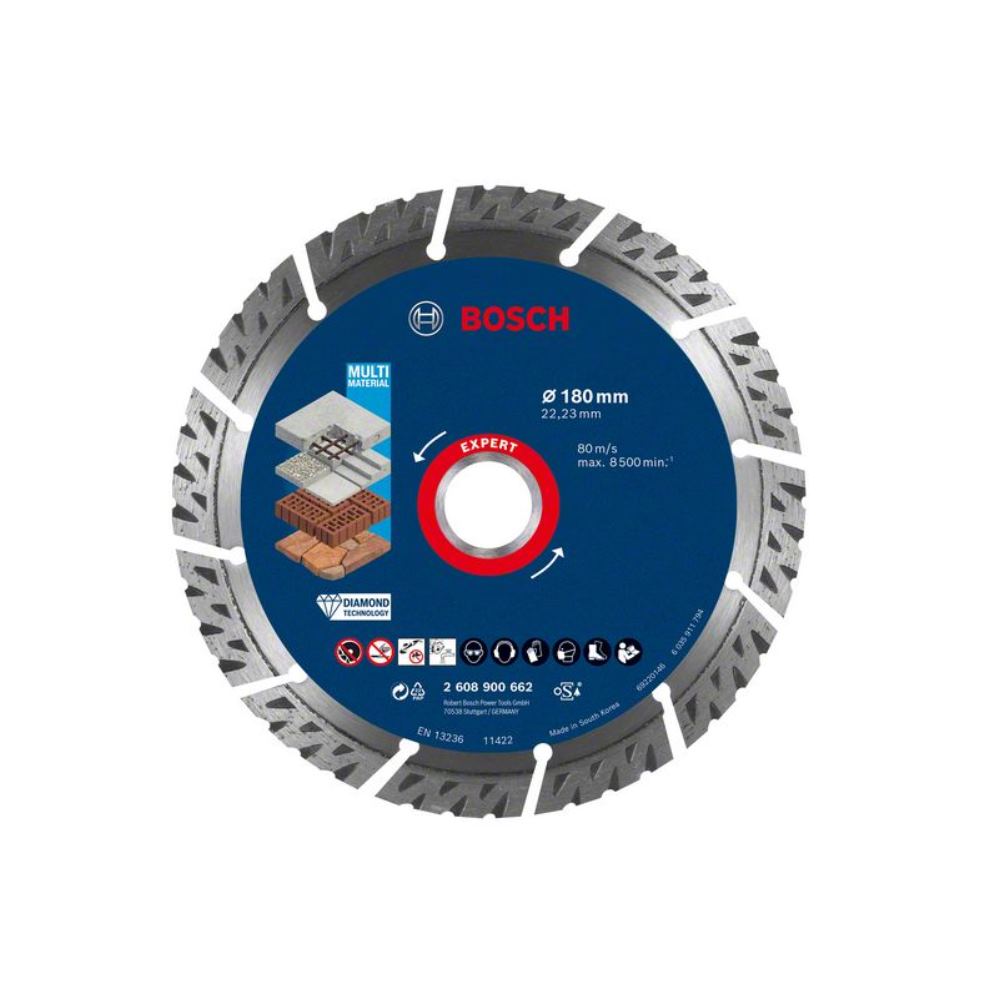- Die Bosch Expert MultiMaterial Diamanttrennscheibe hält bis zu 4-mal länger als eine Standard-Multi Material-Diamanttrennscheibe.
