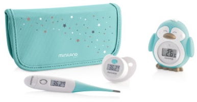 Thermometer-Set bestehend aus Körperthermometer, Badethermometer und Schnuller-Thermometer von miniland. Satz von Thermometern mit einfacher Handhabung für die Babypflege. Mit dabei ein praktisches Etui mit Zippverschluss für die sichere Aufbewahrung und die Beförderung. Körperthermometer: Weiche und flexible Spitze Verlässliche und schnelle Temperaturmessung mit Geräuschanzeige bei Beendigung der Messung Optisches und akkustisches Signal bei Fieber Automatische Abschaltung für einer höhere Lebensdauer der Batterien Material: ABS, TPR, PET, rostfreier Stahl Badethermometer: Schnelle Messung der Badewasser- und der Raumtemperatur Warnanzeige bei zu hoher oder zu niedriger Temperatur Kann in der Badewanne als Spielzeug verwendet werden Erfüllt alle Sicherheitsstandards für Spielzeug Material: PVC, ABS, PMMA, rostfreier Stahl Schnuller-Thermometer: Schnelle Messung der Körpertemperatur mit Geräuschanzeige bei Beendigung der Messung Geräuschanzeige bei Fieber Wasserbeständig Ahmt die Form konventioneller Schnuller nach Mit weicher und angenehmer Textur für die maximale Bequemlichkeit des Babys Automatische Abschaltung für eine längere Lebensdauer der Batterien Material: PP, ABS, Silikon Aufbewahrungstasche: Material: PVC Ermöglicht eine praktische und ordentliche Aufbewahrung des Thermometer-Sets Im Lieferumfang enthalten: Körperthermometer mit einer Batterie (1. 5 V DC (LR41)) Badewasserthermometer mit einer Batterie (CR032) Schnullerthermometer mit zwei Batterien (1. 5 V DC (LR41)) Tasche für Aufbewahrung und Transport Gebrauchsanweisung