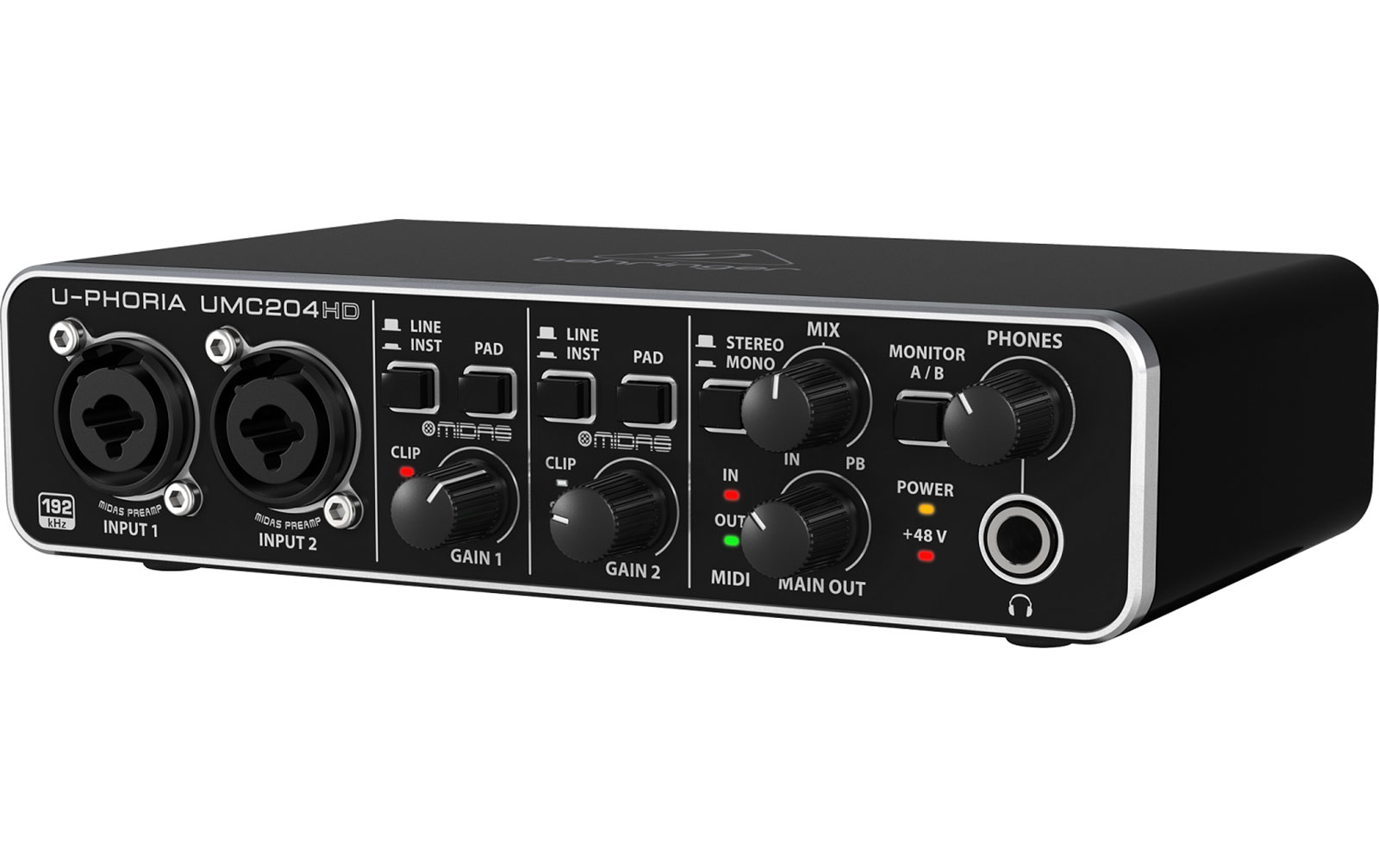 - Das UMC204HD bietet +48V-Phantomspeisung für Mikrofone.