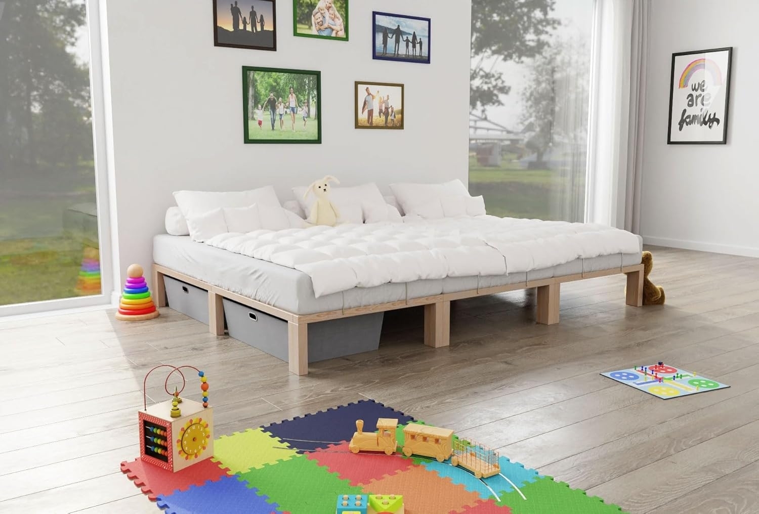 Das Gigapur Massivholzbett G56 bietet Ihnen eine großzügige Liegefläche von 280x200 cm und ist aus massiver, unbehandelter europäischer Kiefer gefertigt. Mit einer Belastbarkeit von 200 kg pro Liegeseite und starren Leisten sorgt es für festen Liegekomfort. Die Montage ist kinderleicht und das Bett kann flexibel erweitert werden. Zudem bietet es durch die 25 cm hohen Füße viel Stauraum. **Highlights** - Belastbarkeit: 200 kg pro Liegeseite für hohe Stabilität - Geräuschlos: Verschraubte Leisten verhindern Verrutschen und Geräusche - Platzsparend: Breite entspricht der gewählten Liegebreite - Flexibel: Einzelbetten können endlos verbunden werden - Natürlich: Unbehandelte Kiefer für individuelle Gestaltung **Produkteigenschaften** - Liegefläche: 280x200 cm - Maße (HxBxT): 29 x 280 x 201,5 cm - Leistenabstand: 2,5 cm für alle Matratzenarten geeignet - Füße: 25 cm hoch für zusätzlichen Stauraum - Verbindungen: Metall mit wiederlösbaren Gewindeschrauben - Werkzeug: Wird mitgeliefert **Lieferumfang** - 1 x Gigapur Massivholzbett G56 - 1 x Lattenrost - 1 x Set Bettverbinder - Werkzeug zur Montage
