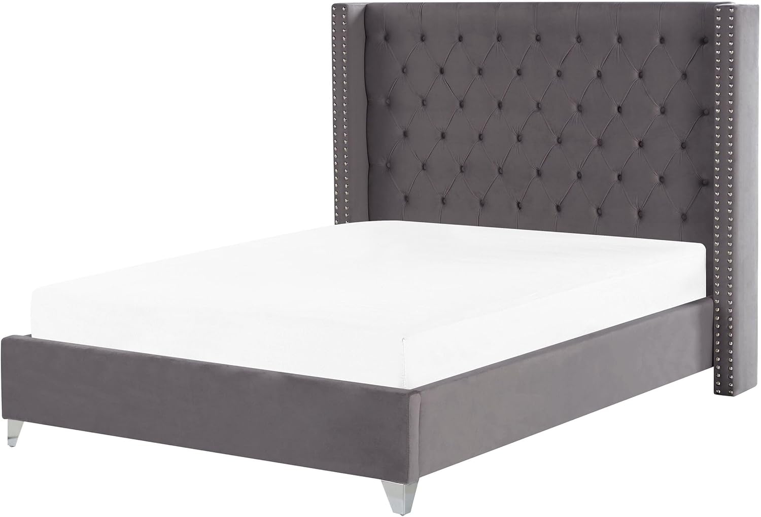 Stilvolles Polsterbett 'LUBBON' in Grau mit einer Liegefläche von 160 x 200 cm. Das elegante Doppelbett überzeugt durch ein hohes, gestepptes Kopfteil und einen robusten Bettrahmen aus Samtstoff. Der mitgelieferte Federholzlattenrost mit 30 Latten sorgt für optimalen Liegekomfort. Mit einer maximalen Belastung von 250 kg und soliden, silberfarbenen Metallbeinen bietet es Stabilität und einen ansprechenden Look. **Highlights** - Hoher, gestepptes Kopfteil für eleganten Komfort - Robuster Bettrahmen mit hochwertigem Samtbezug - Federholzlattenrost mit 30 Latten für besten Liegekomfort - Stilvolle Nieten-Umrandung betont die Konturen - Rundumbezug ermöglicht freie Platzierung im Raum **Produkteigenschaften** - Typ: Doppelbett - Stil: Retro - Farbe: Grau - Material: Samtstoff (100% Polyester) - Zusätzliches Material: Kiefernholz - Kopfteil: 190 x 142 cm - Breite: 189 cm - Länge: 215 cm - Höhe: 142 cm - Liegefläche: 160 x 200 cm - Gewicht: 53 kg - Max. Belastung: 250 kg - Montage: Nicht montiert, 20 - 40 Min. **Lieferumfang** - 1 x Federholzlattenrost (30 Latten) - 1 x Bettrahmen - Nicht im Lieferumfang enthalten: Matratze, Bettwäsche und Kissen