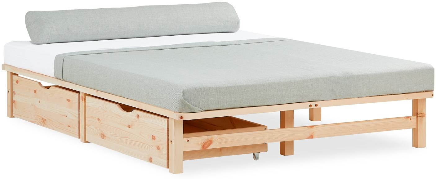 Das Palettenbett 140x200 cm mit Bettkasten 2er Set ist ein modernes Massivholzbett im angesagten Paletten-Design. Mit 2 Schubfächern, 2 Rollrosten und stabiler Verarbeitung überzeugt es durch natürliche Schönheit. Ideal für kleine Räume wie Schlafzimmer, Jugendzimmer oder Loft. Bettgestell und Schubladen aus Kiefer massiv in Naturfarben. **Highlights** - Modernes Doppelbett im Paletten-Design - Inklusive 2 Schubfächern und 2 Rollrosten - Platzsparend und belastbar - Robustes Holz mit abgerundeten Kanten - Perfekt für kleine Räume **Produkteigenschaften** - Liegefläche: 140x200 cm - Bett Stellmaß: 140x200 cm - Oberkante Bettseite: 28 cm - Stauhöhe unter dem Bett: 25 cm - Materialstärke: 30 mm - Pfostenstärke: 4,8 cm - Bettkasten Außenmaße: 82 x 22 x 53,3 cm - Bettkasten Innenmaße: 72,2 x 12 x 51,2 cm - Materialstärke Bettkasten: 1,6 cm **Lieferumfang** - Bettgestell mit 2x Lattenrost, 2x Bettschublade und Aufbauanleitung