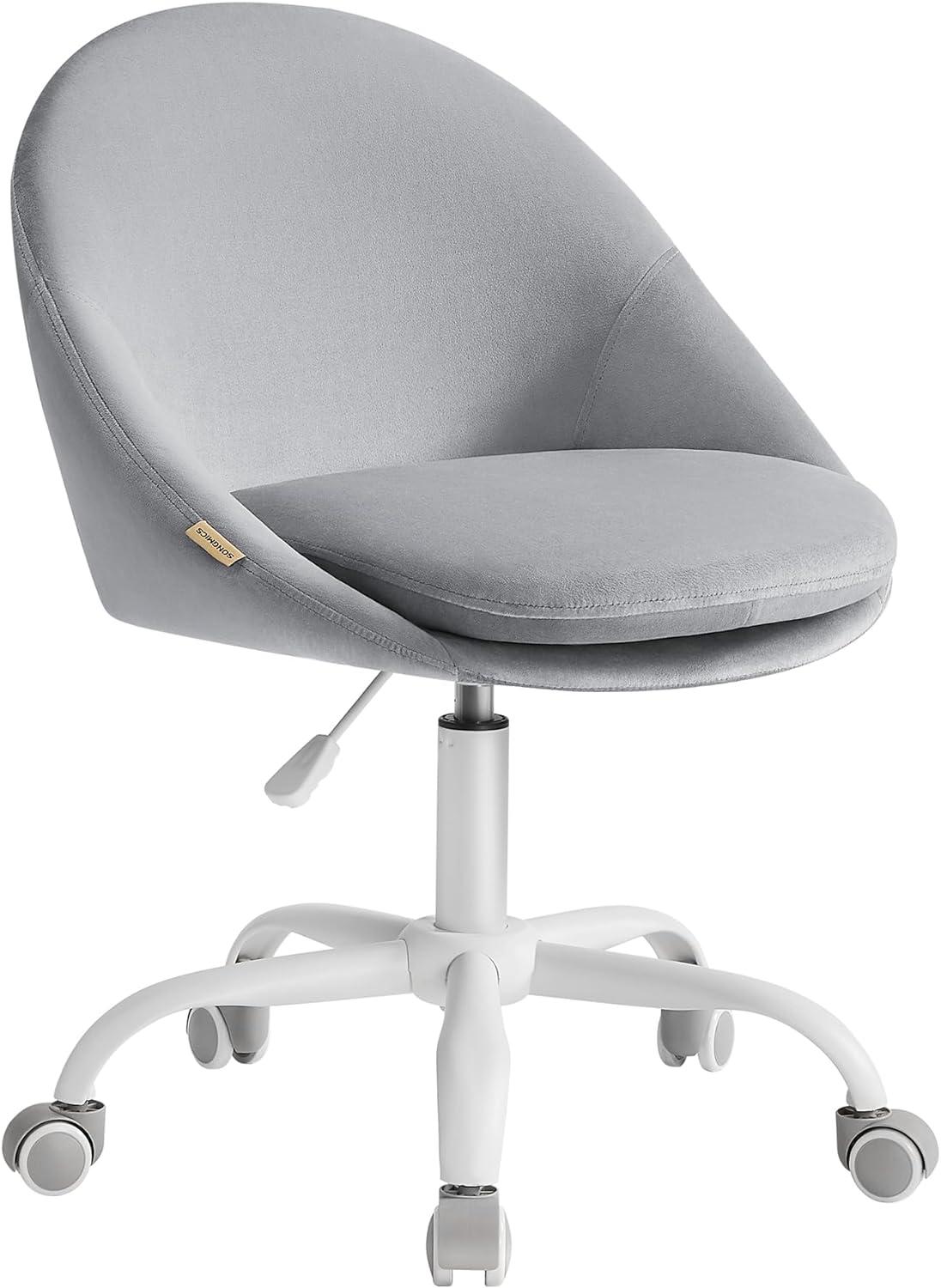 **\[Stilvoll & vielseitig\]** Mit dem schicken Look und den einfachen, geometrischen Linien verleiht dieser Drehstuhl Ihrem Zimmer einen einzigartigen Charme. Sie können ihn zum Arbeiten, Lernen oder zum Schminken verwenden **\[Platzsparend\]** Dieser kompakte 360° drehbare Schreibtischstuhl (60x60 cm) ist um 10 cm höhenverstellbar und hat keine Armlehnen. Bei Nichtgebrauch können Sie den Stuhl unter den Schreibtisch schieben, um Platz zu sparen **\[Hoher Sitzkomfort\]** Doppeltes gut gepolstertes Kissen (Oberes 7 cm dick), geschwungen geformte, große Sitzfläche entlasten den Druck auf Ihre Hüften; der Bezug aus Samt ist atmungsaktiv. Alles bietet hohen Sitzkomfort **\[Einfache Montage\]** Befestigen Sie die Bodenplatte mit Schrauben unten an der Sitzfläche, installieren Sie die Gaszylinder und die Rollen – nur einige Schritte ist schon der Computerstuhl fertig aufgebaut **\[Zuverlässiger Halt\]** Der Stuhl hat den Festigkeits- und Haltbarkeitstest von TÜV Rheinland gemäß EN12520 bestanden (Bericht Nr. AJHL2302000327FT; Inhaber: EUZIEL; ausgestellt am 27.10.2022) und ist bis zu 110 kg belastbar - **Sicherer Gasdruckzylinder** Der Gasdruckzylinder hat 120.000 Iterationen des Sicherheitstests bestanden (vom Lieferanten getestet). - **Langlebige Rollen** Die Rollen haben 100.000 Iterationen des Zyklentests beim Teilelieferanten bestanden (vom Lieferanten getestet). - **Stabiles Fußkreuz** Das Fußkreuz hat den statischen Drucktest für von 1.136 kg eine Minute lang bestanden, ohne zu brechen (vom Lieferanten getestet). **Produktdetails:** - Farbe: Taubengrau - Material: Stahlgestell, Samt, Nylonräder, 28 kg/m³ Schaumstoffpolsterung - Größe: 60x60 x (80-90) cm (T x B x H) - Höhe des Sitzes (ab Boden): 47-57 cm - Größe der Sitzfläche: 45x42 cm (T x B) - Höhe der Rückenlehne: 37 cm - Dicke des Kissens insgesamt: 12 cm - Dicke des oberen Kissens: 7 cm - Gewicht: 8,2 kg - Max. statische Belastbarkeit: 110 kg **Lieferumfang:** - 1 x Drehstuhl - 1 x Zubehörpaket - 1 x Anleitung **SONGMICS Hinweise:** - Das Kissen und der Stoffbezug sind nicht abnehmbar oder waschbar."