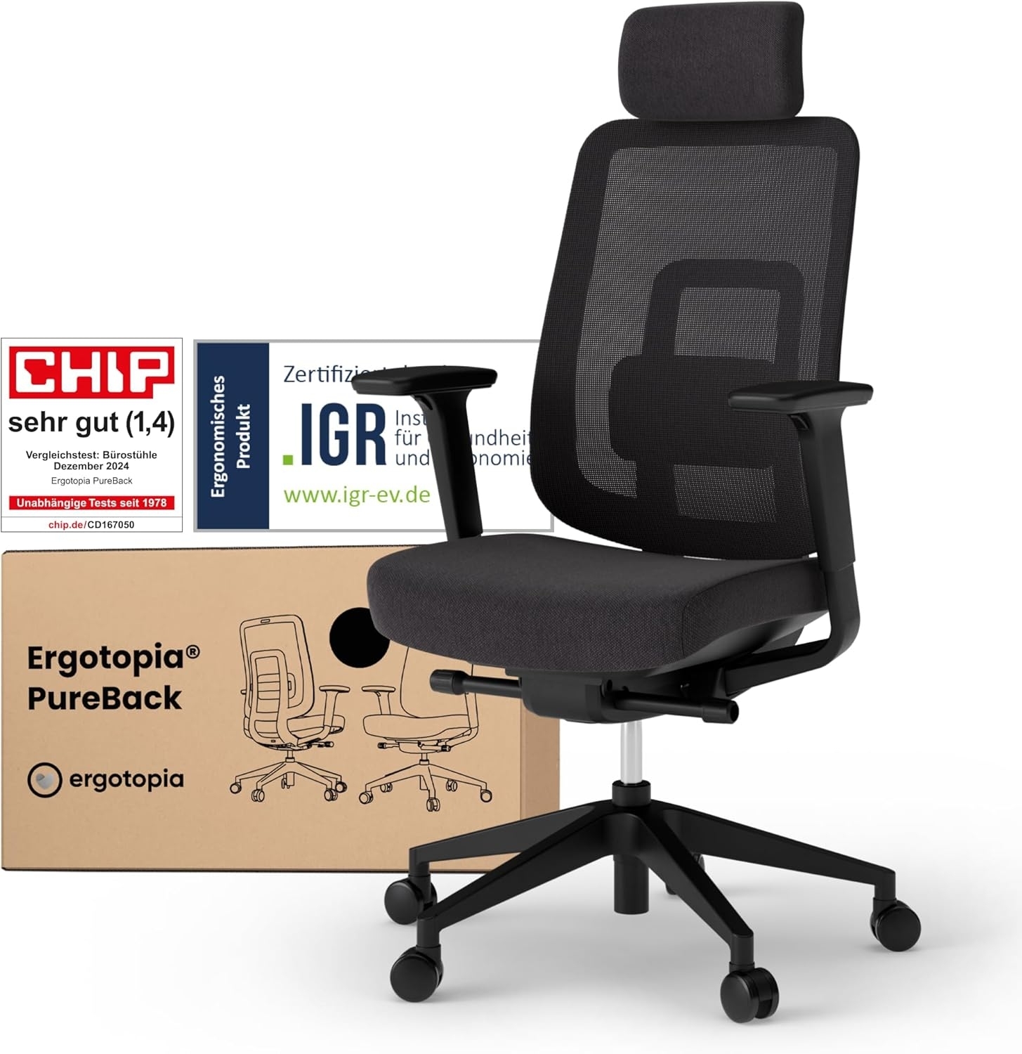 | Name | Ergotopia 'PureBack' ergonomischer Bürostuhl mit Lordosenstütze & 4D-Armlehne, Schwarz, mit Kopfstütze |