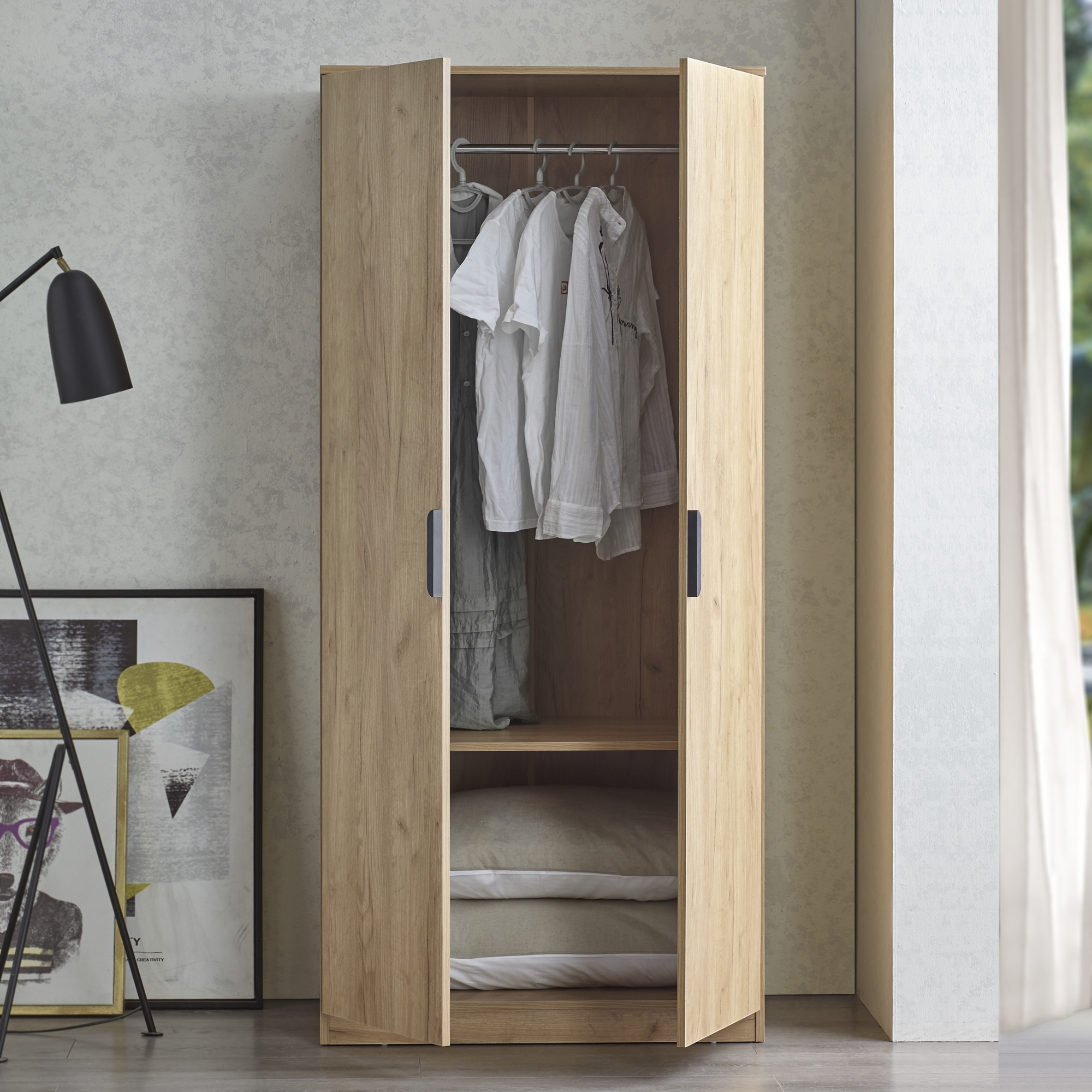 Der moderne Kleiderschrank von en. casa bietet mit seinen kompakten Maßen von 176 x 80 x 52 cm eine stilvolle Lösung zur Aufbewahrung Ihrer Kleidung und Accessoires. Mit zwei Türen, einer praktischen Kleiderstange und einem zusätzlichen Einlegeboden sorgt er für eine organisierte und elegante Atmosphäre in Ihrem Schlafzimmer oder Ankleidezimmer. Die pflegeleichte Oberfläche und die einfache Montage machen ihn zu einer idealen Wahl für jeden Raum. **Highlights** - Eleganter und zeitloser Kleiderschrank mit zwei Schranktüren - Großzügiger Stauraum für Kleidung, Schuhe und Accessoires - Praktische Garderobenstange zum Aufhängen Ihrer Kleidung - Unteres Ablagefach im Schrankinnern für weiteren Stauraum - Schneller und einfacher Aufbau **Produkteigenschaften** - Material: MDF - Maße (HxBxT): 176 x 80 x 52 cm - Hängebereich Innen (HxBxT): 120 x 77 x 48,5 cm - Unteres Fach Innen (HxBxT): 45,5 x 77 x 48,5 cm - Farbe: Eiche **Lieferumfang** - 1 x Kleiderschrank