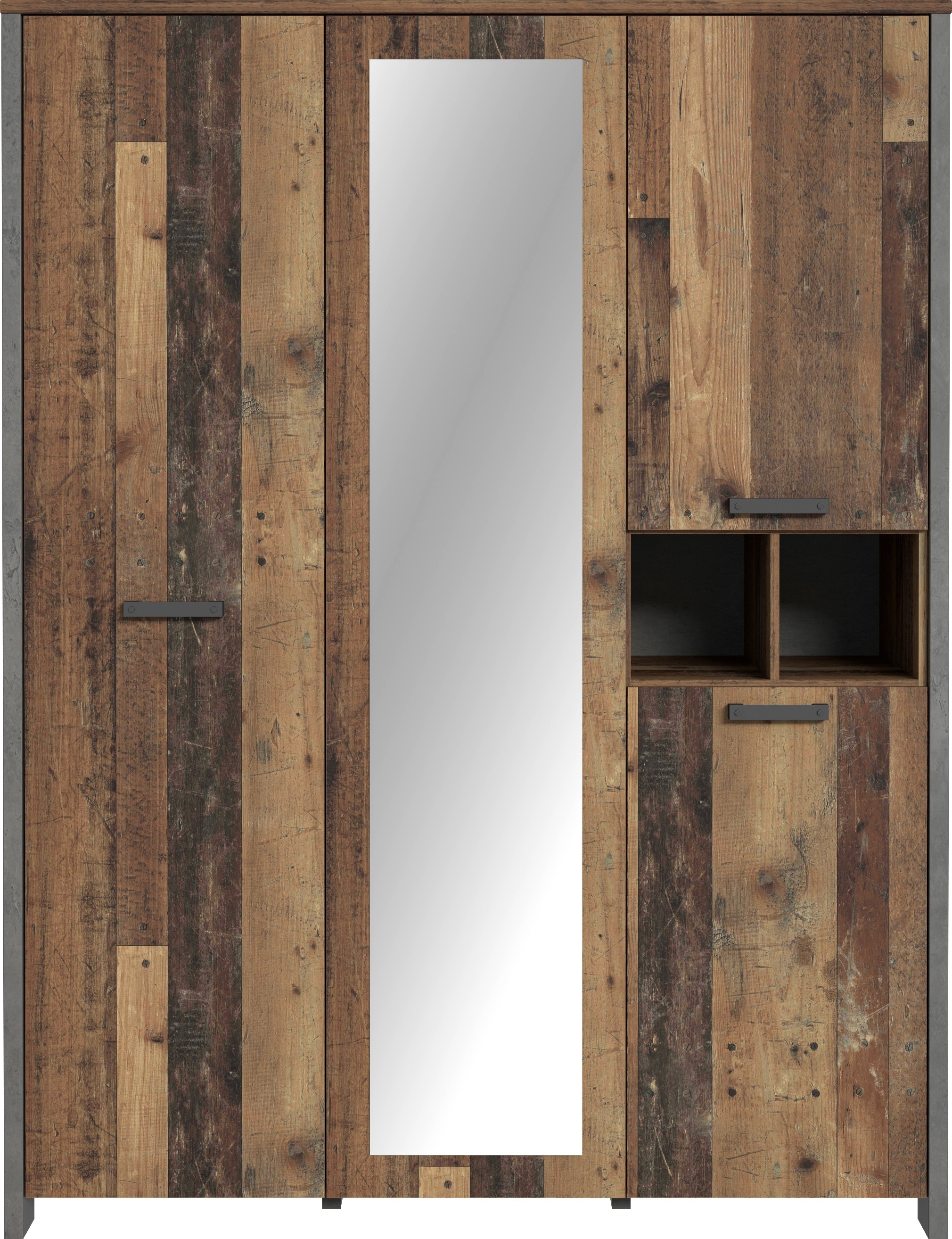 Kleiderschrank CLIF in Old Wood und Beton dunkelgrau Mit dem Kleiderschrank CLIF bringen sie einen individuellen Charme im rustikalen Look in das Zimmer Ihres Kindes. Die farblichen Bestandteile des Altholzes im Vintagestyle, die Absetzungen im Betonlook in dunkelgrau und der Spiegel heben diesen Schrank hervor und machen es zu einem Favoriten zwischen den Kinderzimmermöbeln verschiedener Programme. Der Jugendzimmerschrank mit drei Holz-, einer Spiegeltür und zwei Fächern ist auch sehr geräumig. Weitere Zusatzartikel aus der Serie finden Sie in unserem Shop. **Ausführung**: 1x Kleiderschrank CLIF **Material**: Holzspanwerkstoff Korpus: Old wood vintage Dekor Front: Old wood vintage Dekor Absetzungen: Beton dunkelgrau Dekor 4 Drehtüren 1 Spiegel 2 offene Fächer 1 Mittelseite 3 Holzböden 1 Kleiderstange Metallbeschläge Griffe: Schwarz Zerlegte Ware - Eine bebilderte Aufbauanleitung für die Endmontage liegt bei! **Maße**: B/H/T: ca. 156,4/204,7/52,3 cm **Besonderheit:** Inkl. Spiegel! **Lieferumfang:** Originalverpackte Neuware Angebot ohne Beimöbel und Dekoration