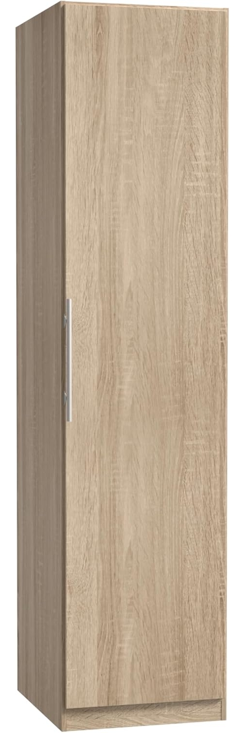 Schöner Kleiderschrank in modernem Design in Sonoma Eiche mit alufarbenem Griff. Der Schlafzimmerschrank Cadixo ist mit einer Drehtür und vier Einlegeböden ausgestattet. Er bietet viel Platz für Ihre Kleidung und andere Utensilien. **Ausführung**: 1x Kleiderschrank CADIXO **Material**: Holzspanwerkstoff Korpus: Sonoma Eiche Dekor Front: Sonoma Eiche Dekor 1 Drehtür 4 Einlegeböden Griffe: Alufarbig Zerlegte Ware - Eine bebilderte Aufbauanleitung für die Endmontage liegt bei! **Maße**: B/H/T: ca. 51,2/212,9/58,9 cm **Lieferumfang:** Originalverpackte Neuware Angebot ohne Beimöbel und Dekoration Wir bitten Sie zu beachten, dass die Farbdarstellungen der Produktbilder auf ihrem Monitor abweichen können und nicht verbindlich sind.