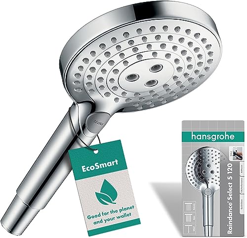 in Duschinstallationhansgrohe Raindance Select S - wassersparender Duschkopf 9 l/min (EcoSmart), Handbrause mit 3 Strahlarten, runde Duschbrause (⌀ 120 mm), Sparduschkopf mit Antikalk-Funktion, Chrom