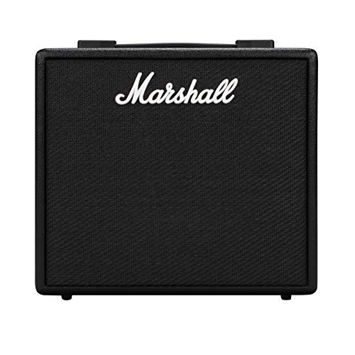 - Der Marshall CODE 25 ist ein E-Gitarrenverstärker in Schwarz, der sich durch seine kompakte Bauweise und vielseitigen Klangmöglichkeiten auszeichnet