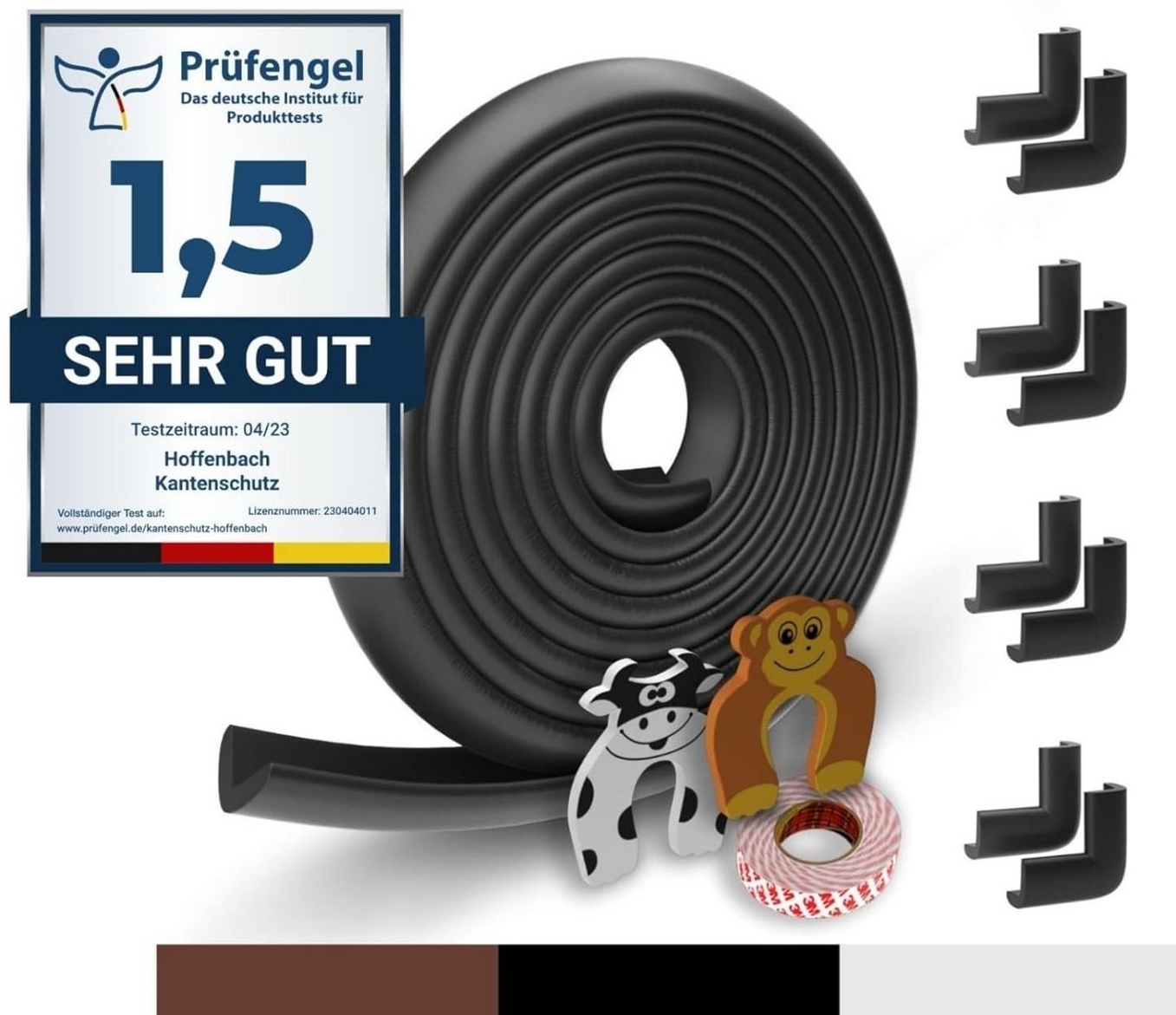 Der Kantenschutz Baby von Hoffenbach Germany bietet mit 6,2m Tischkantenschutz, 8 Eckenschützern und 2 Fingerschützern umfassenden Schutz für Ihr Zuhause. Die selbstklebenden, BPA-freien Materialien garantieren Sicherheit und Gesundheit. Dank 3M Klebestreifen sitzt der Schaumstoff bombenfest und lässt sich rückstandslos entfernen. **Highlights** - Premium Qualität für maximalen Schutz - Materialien sind BPA-frei und geruchlos - Original 3M Klebestreifen für sicheren Halt - Großes Set für umfassende Kindersicherung - 2 Jahre Garantie für sorgenfreien Kauf **Produkteigenschaften** - Farben: Schwarz, Braun, Weiß - Maße: 6,2m Tischkantenschutz, 8 Eckenschützer, 2 Fingerschützer - Material: Weicher, geruchloser Schaumstoff - Dicke: 7mm für zuverlässigen Schutz - Selbstklebend und rückstandslos entfernbar
