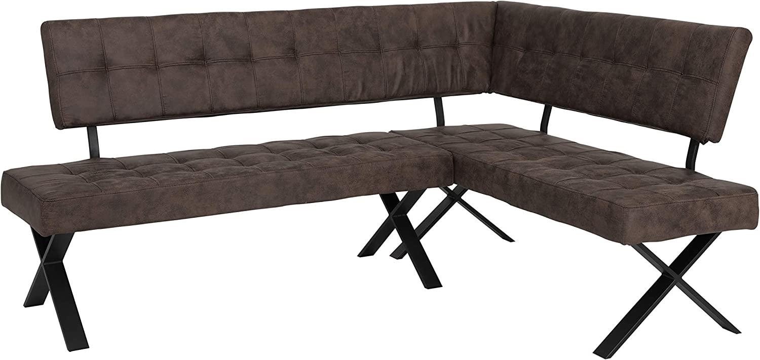 Die Eckbank Donna in Vintage Braun überzeugt durch ihr robustes X-Metallgestell in anthrazit und den ansprechenden Bezug aus Softtex Vintage Braun. Mit einer maximalen Belastbarkeit von 340 kg (max. 120 kg/Person) und den Maßen 200 x 150 x 92 cm bietet sie sowohl Stabilität als auch Komfort. **Highlights** - X-Metallgestell für Stabilität - Bezug aus Softtex Vintage Braun für ein ansprechendes Design - Fest gepolsterter Sitz mit Steppung für Komfort - Max. Belastbarkeit von 340 kg - Einfacher Aufbau dank übersichtlicher Anleitung **Produkteigenschaften** - Stoffzusammensetzung: 100 % Polyester - Sitztiefe: 48 cm - Sitzhöhe: 48 cm - Gesamttiefe: 61 cm **Lieferumfang** - 1x Eckbank Donna - Braun / Anthrazit